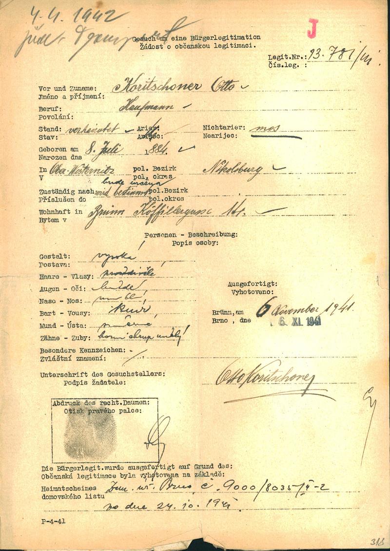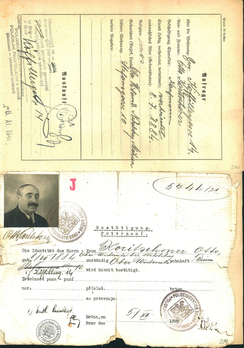 Moravský zemský archiv Brno > Policejní ředitelství Brno > Žádosti židovských občanů určených k transportu o občanské legitimace > Koritschoner Otto