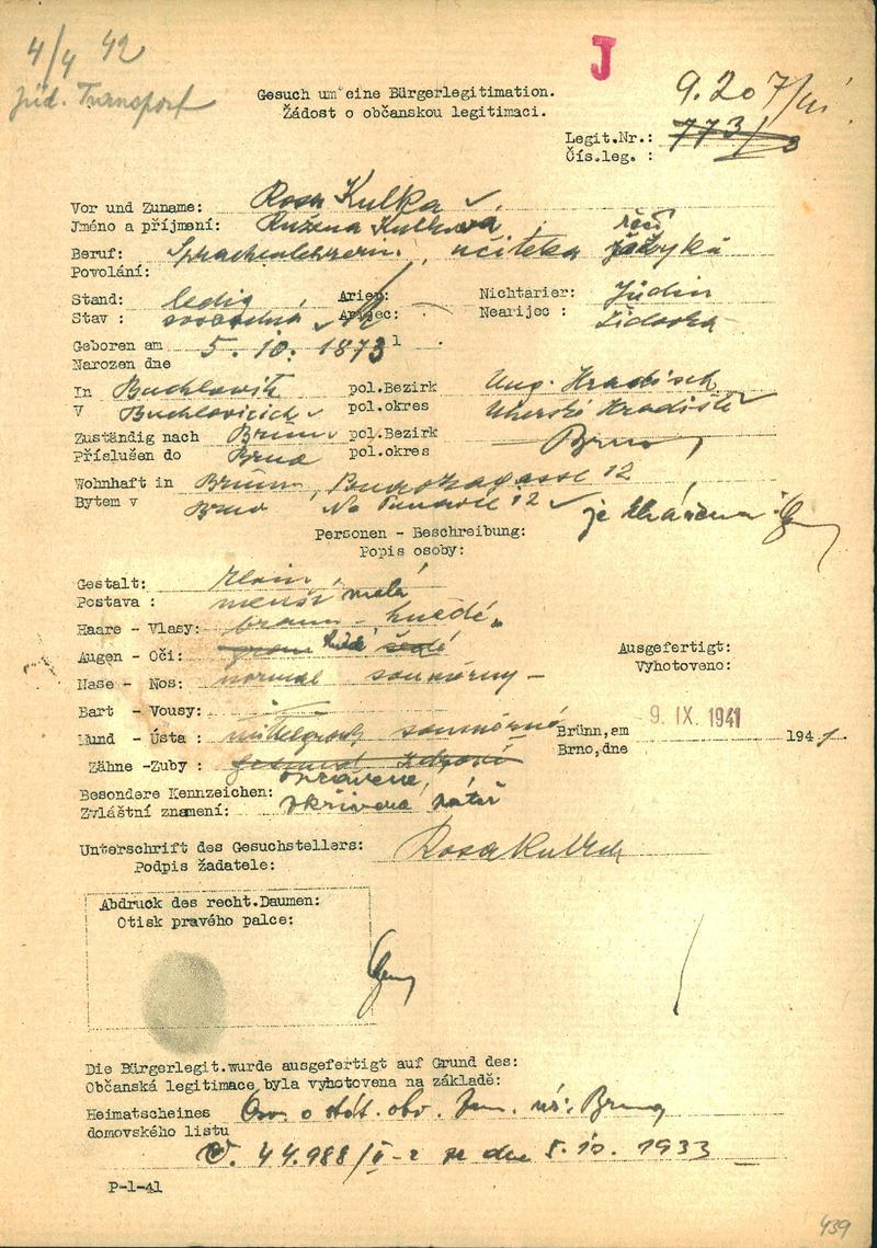 Moravský zemský archiv Brno > Policejní ředitelství Brno > Žádosti židovských občanů určených k transportu o občanské legitimace > Kulková Rosa