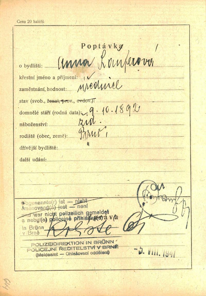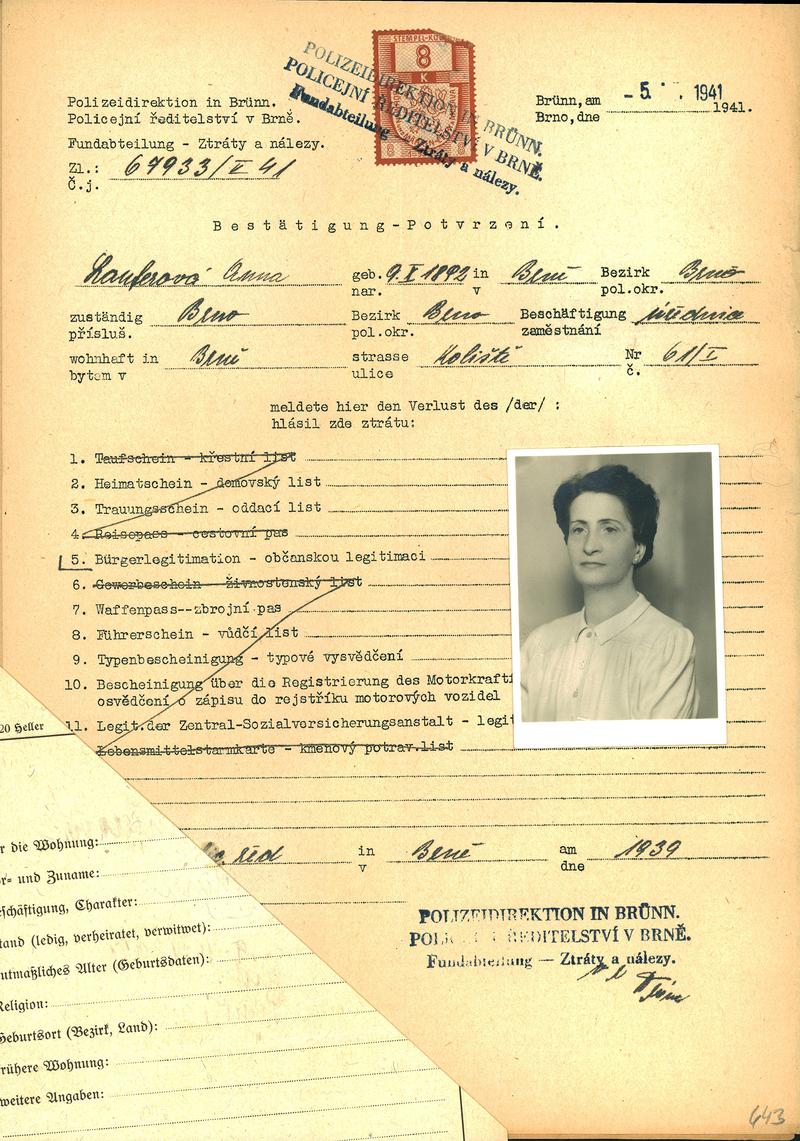 Moravský zemský archiv Brno > Policejní ředitelství Brno > Žádosti židovských občanů určených k transportu o občanské legitimace > Lauferová Anna
