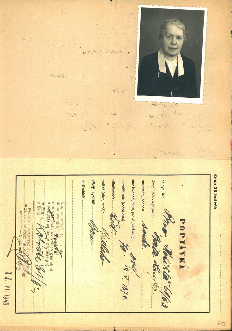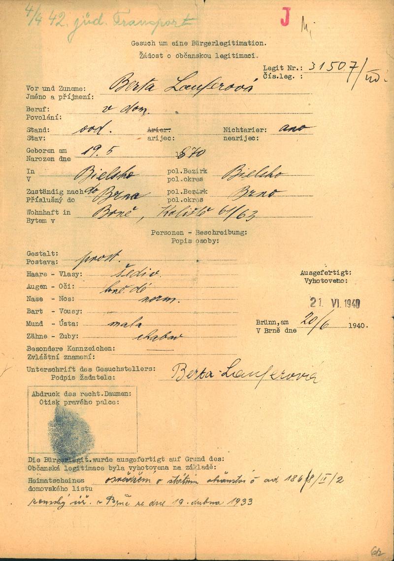 Moravský zemský archiv Brno > Policejní ředitelství Brno > Žádosti židovských občanů určených k transportu o občanské legitimace > Lauferová Berta