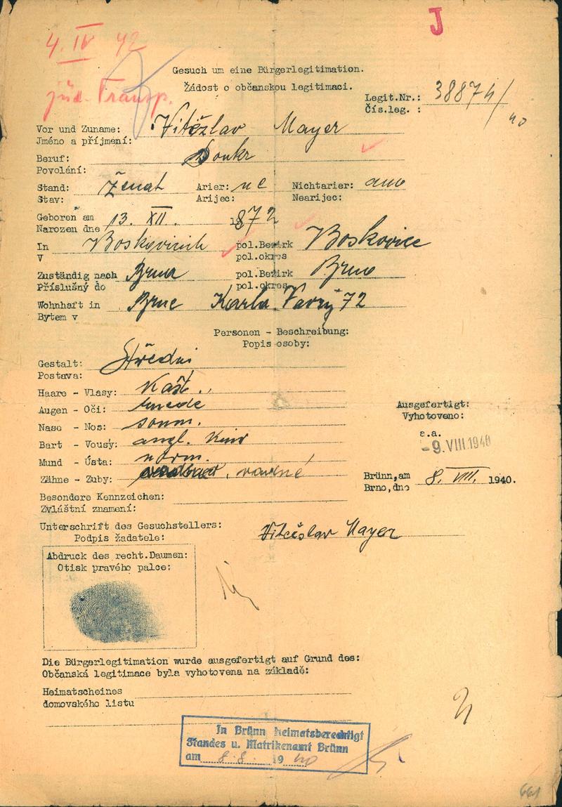 Moravský zemský archiv Brno > Policejní ředitelství Brno > Žádosti židovských občanů určených k transportu o občanské legitimace > Mayer Siegfried