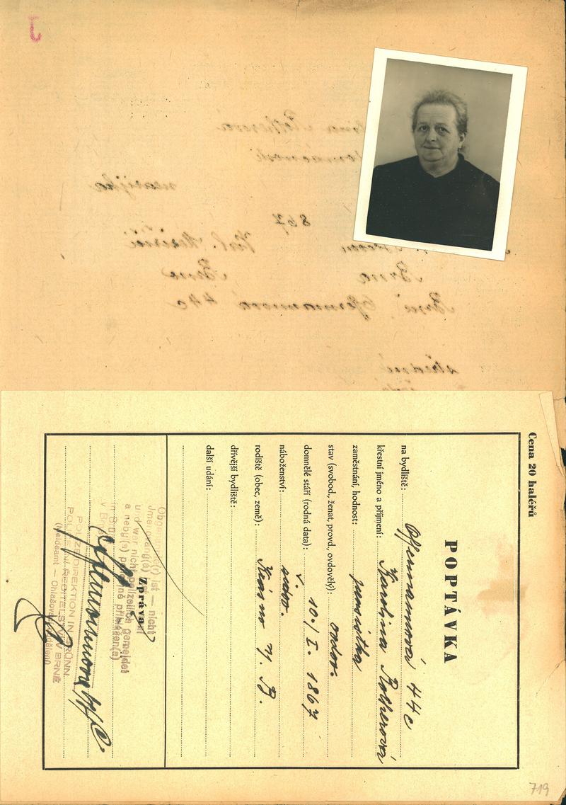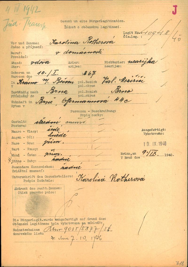 Moravský zemský archiv Brno > Policejní ředitelství Brno > Žádosti židovských občanů určených k transportu o občanské legitimace > Rotherová Karolina