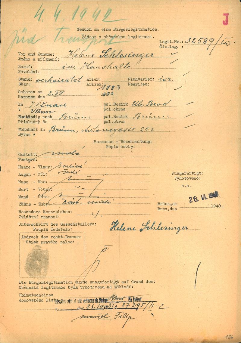 Moravský zemský archiv Brno > Policejní ředitelství Brno > Žádosti židovských občanů určených k transportu o občanské legitimace > Schlesingerová Helena