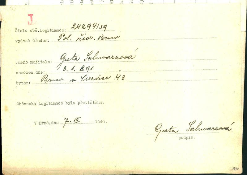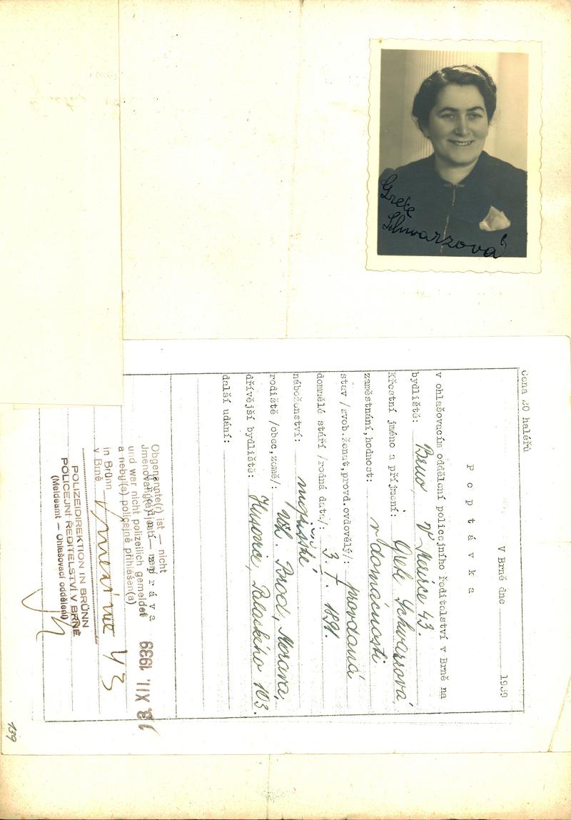 Moravský zemský archiv Brno > Policejní ředitelství Brno > Žádosti židovských občanů určených k transportu o občanské legitimace > Schwarzová Greta