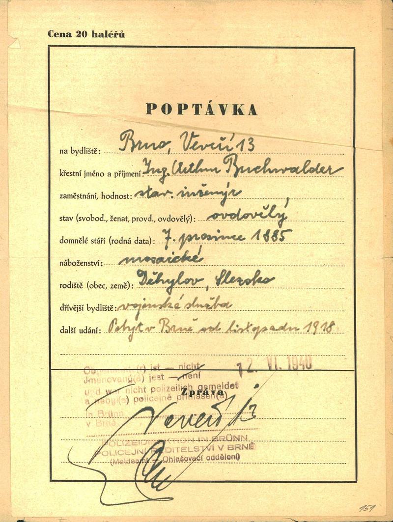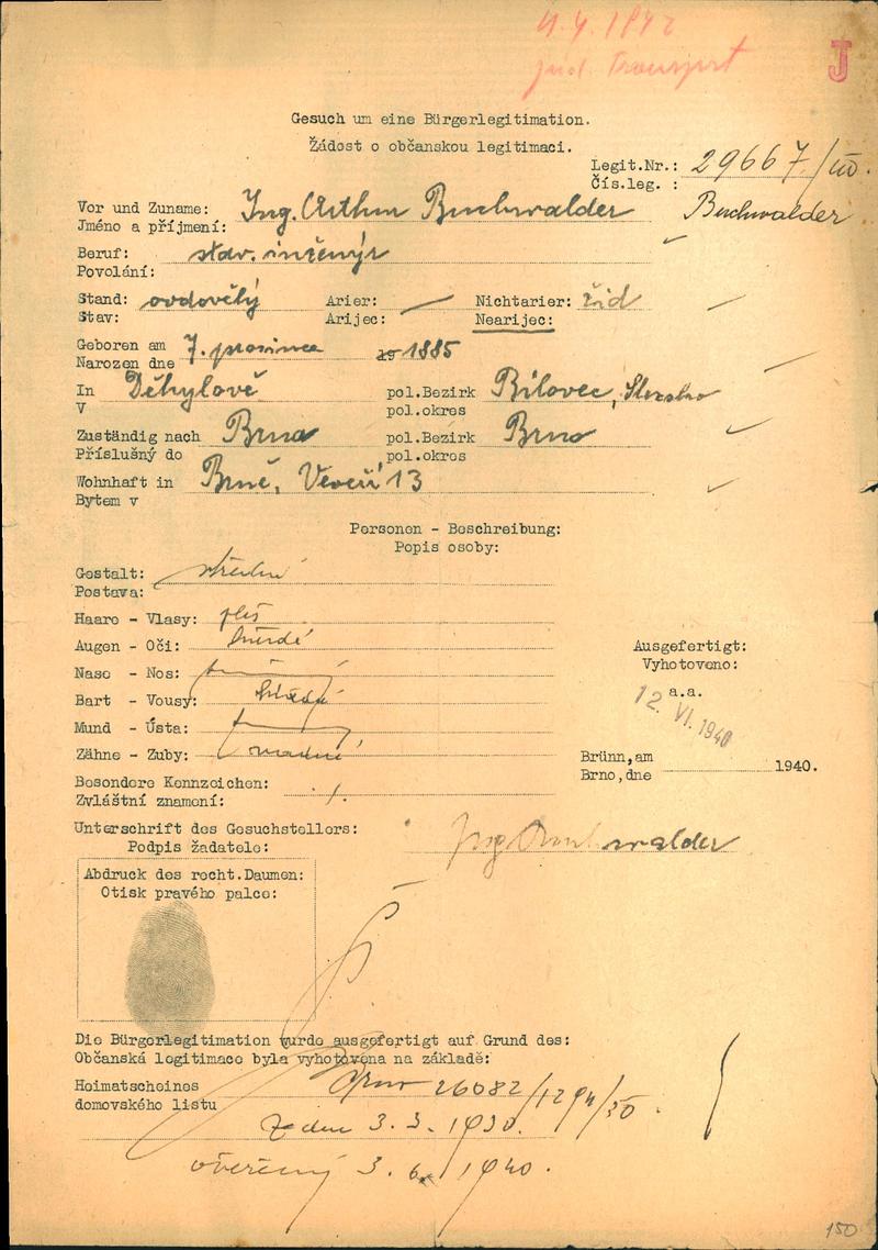 Moravský zemský archiv Brno > Policejní ředitelství Brno > Žádosti židovských občanů určených k transportu o občanské legitimace > Buchwalder Artur