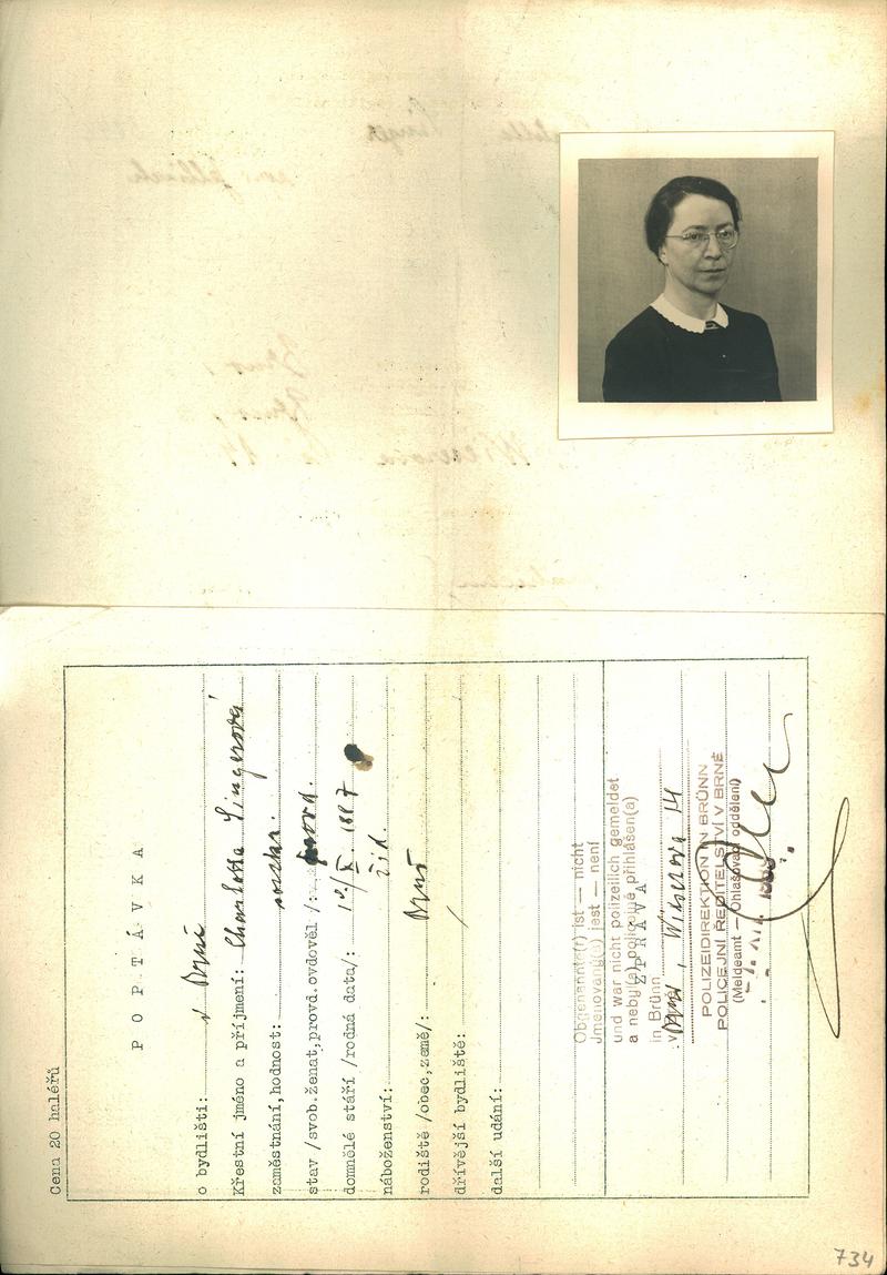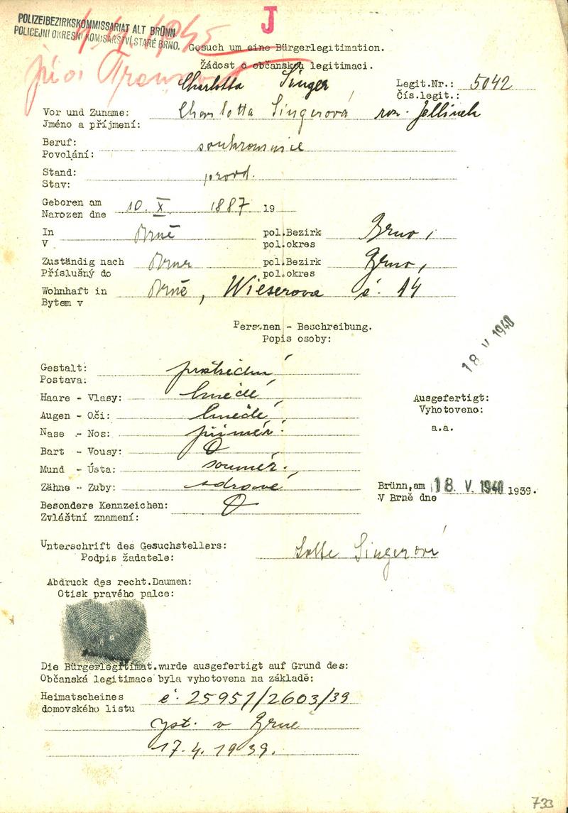 Moravský zemský archiv Brno > Policejní ředitelství Brno > Žádosti židovských občanů určených k transportu o občanské legitimace > Singerová Lota