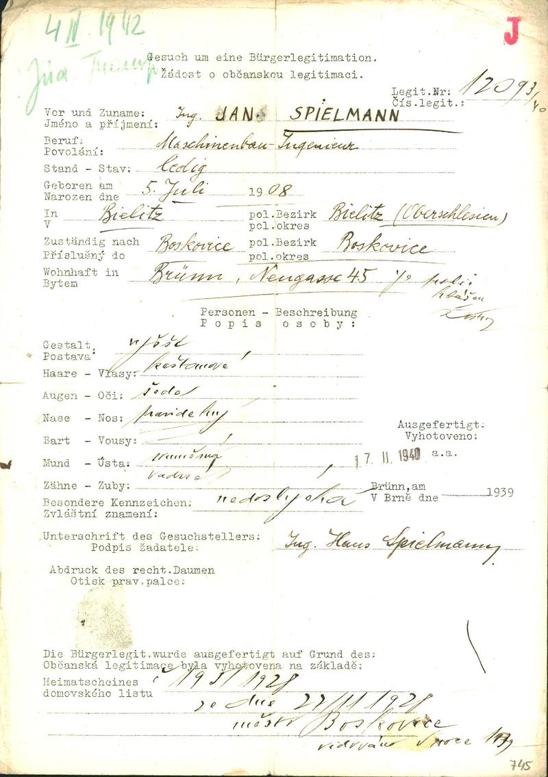 Moravský zemský archiv Brno > Policejní ředitelství Brno > Žádosti židovských občanů určených k transportu o občanské legitimace > Spielmann Hanuš