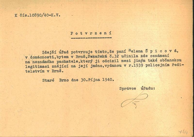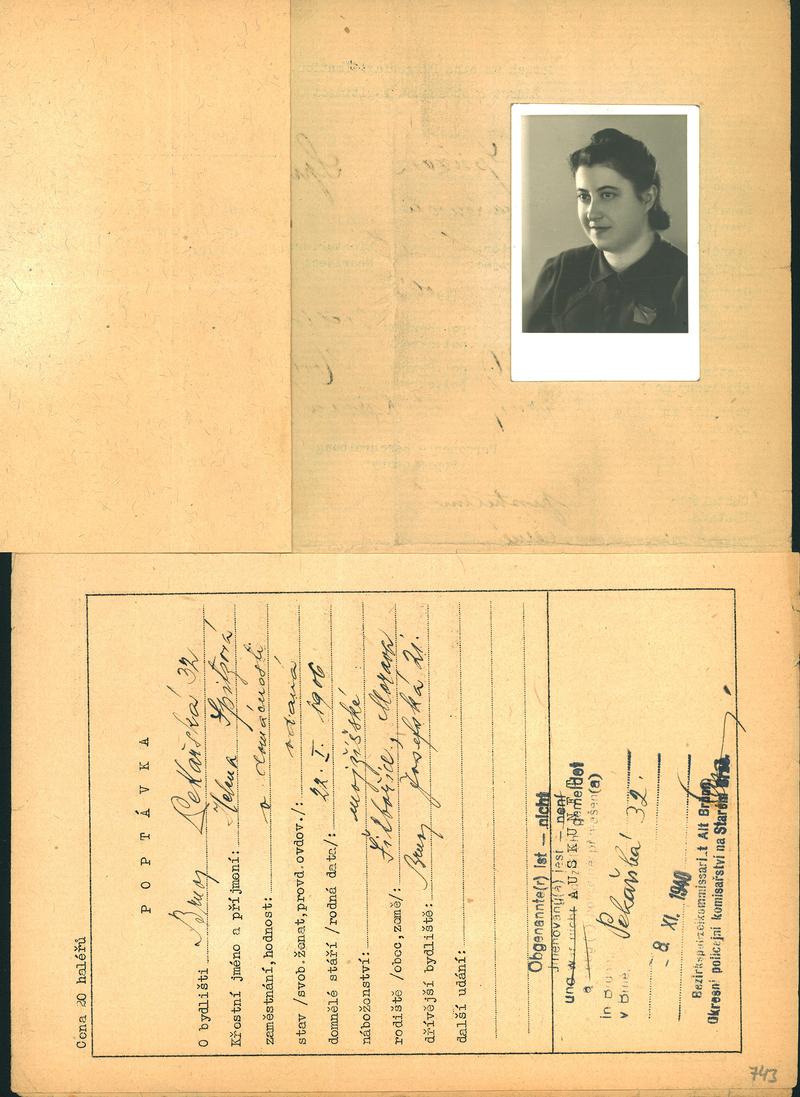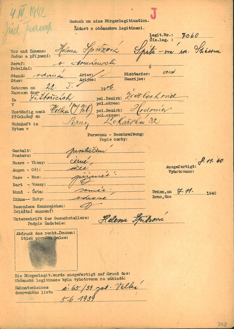Moravský zemský archiv Brno > Policejní ředitelství Brno > Žádosti židovských občanů určených k transportu o občanské legitimace > Spitzová Helena