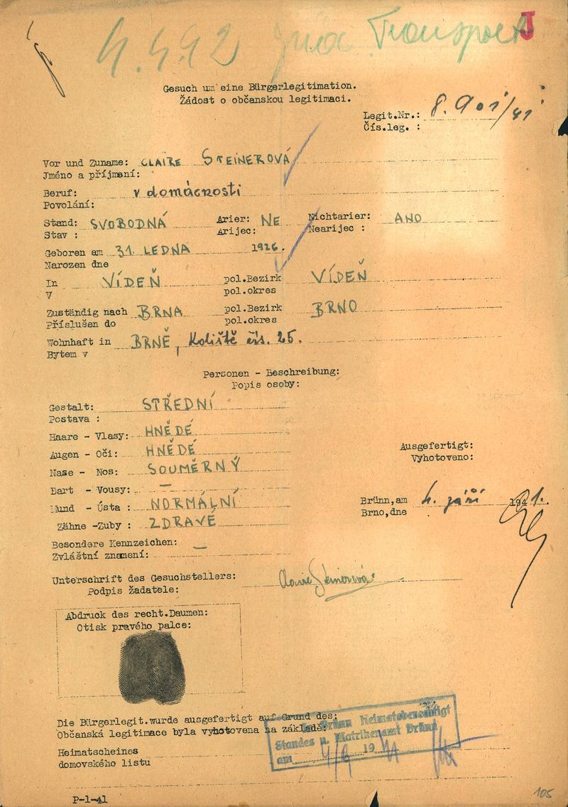 Moravský zemský archiv Brno > Policejní ředitelství Brno > Žádosti židovských občanů určených k transportu o občanské legitimace > Steinerová Klára