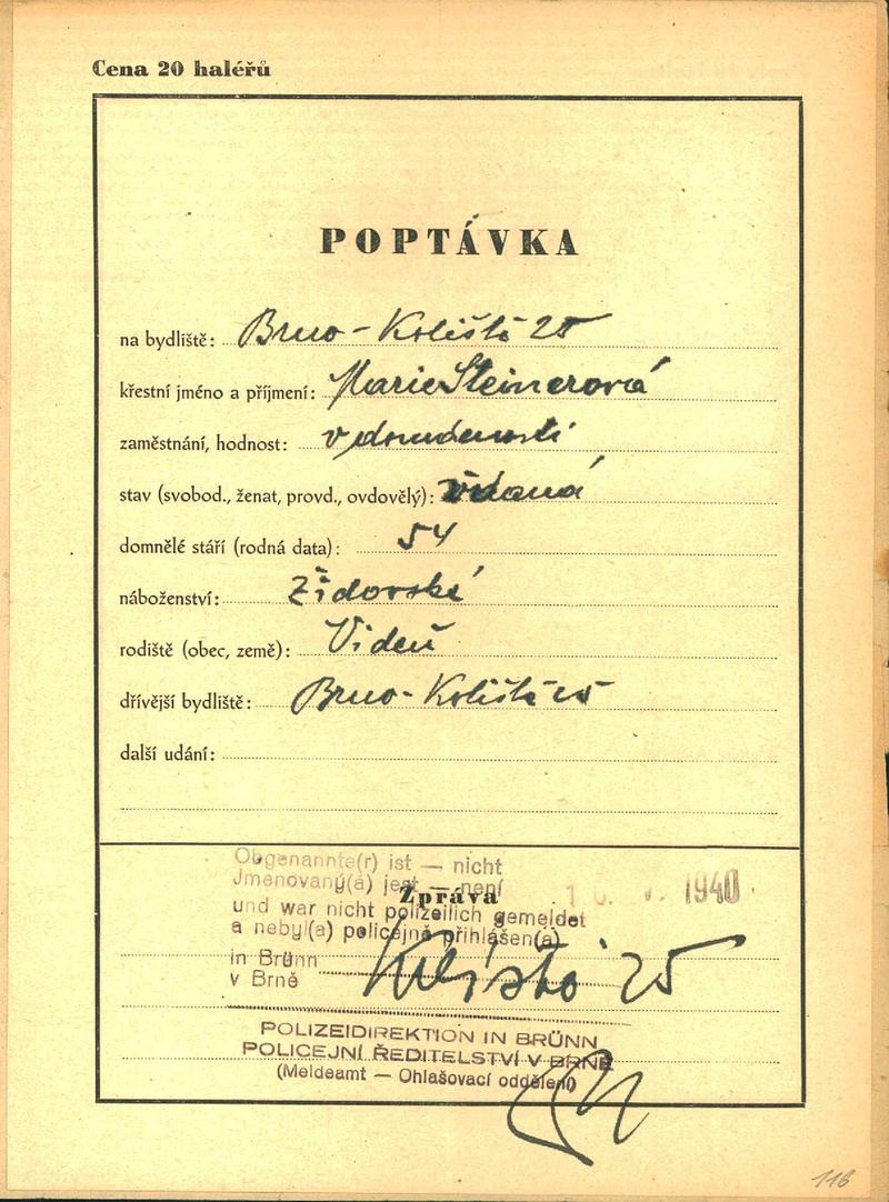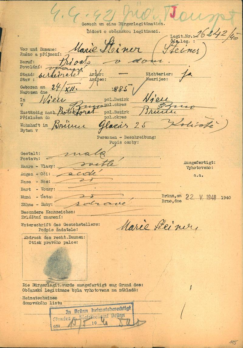 Moravský zemský archiv Brno > Policejní ředitelství Brno > Žádosti židovských občanů určených k transportu o občanské legitimace > Steinerová Marie