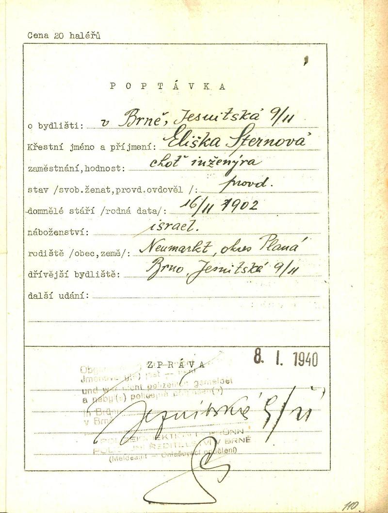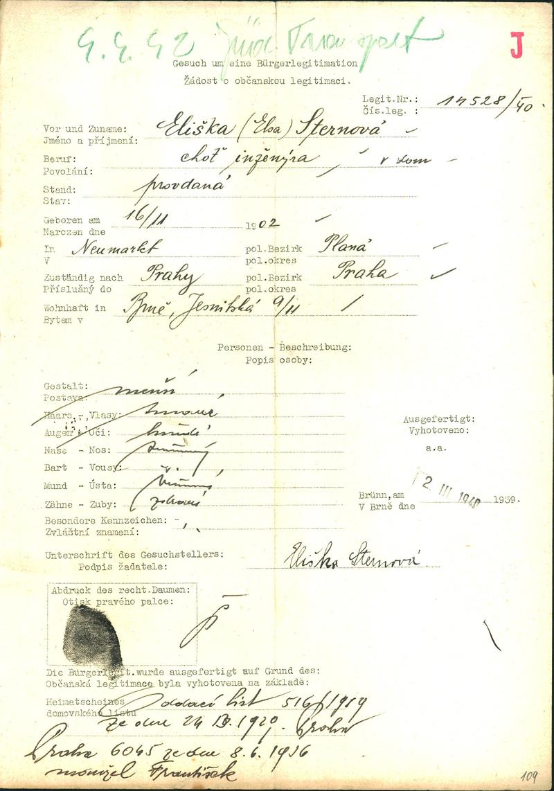Moravský zemský archiv Brno > Policejní ředitelství Brno > Žádosti židovských občanů určených k transportu o občanské legitimace > Sternová Eliška