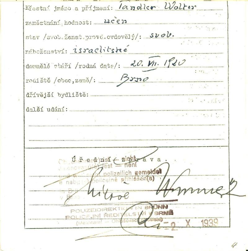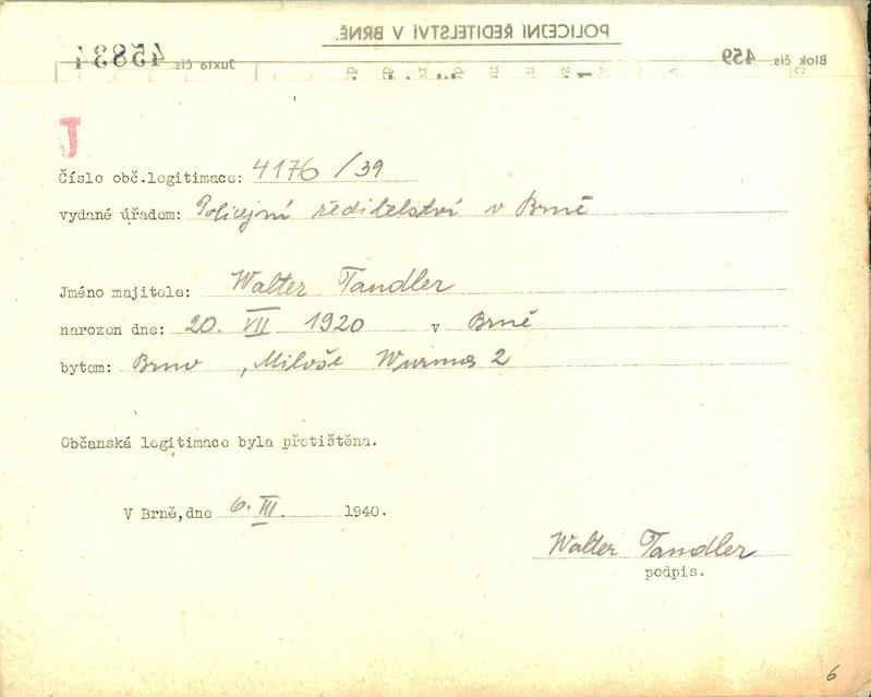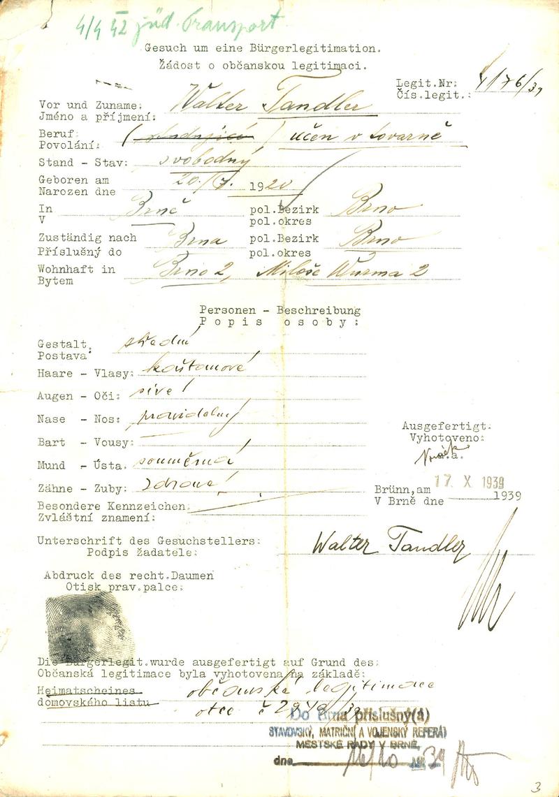 Moravský zemský archiv Brno > Policejní ředitelství Brno > Žádosti židovských občanů určených k transportu o občanské legitimace > Tandler Valtr