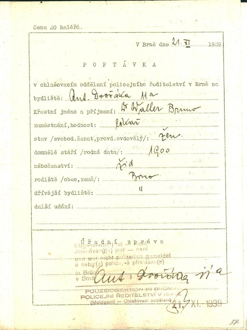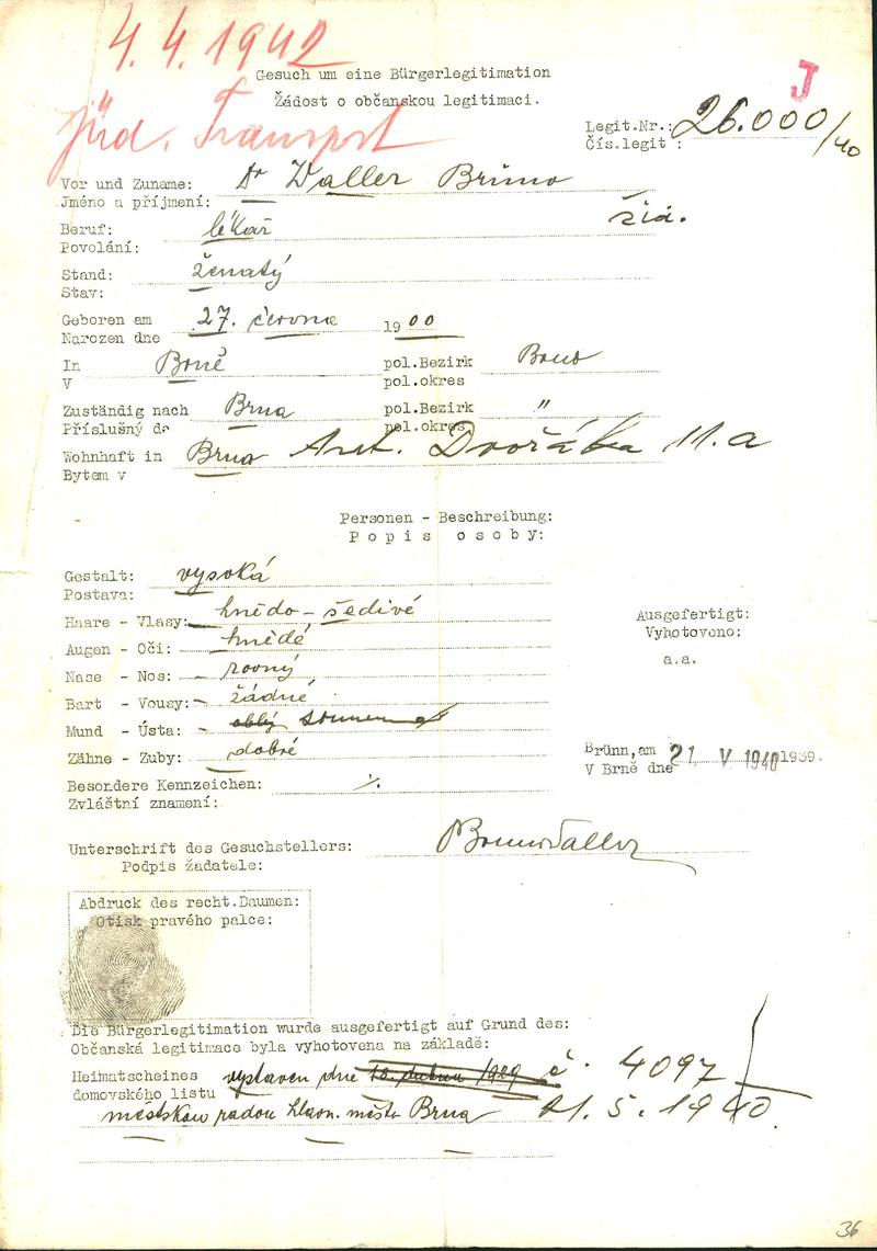 Moravský zemský archiv Brno > Policejní ředitelství Brno > Žádosti židovských občanů určených k transportu o občanské legitimace > Waller Bruno