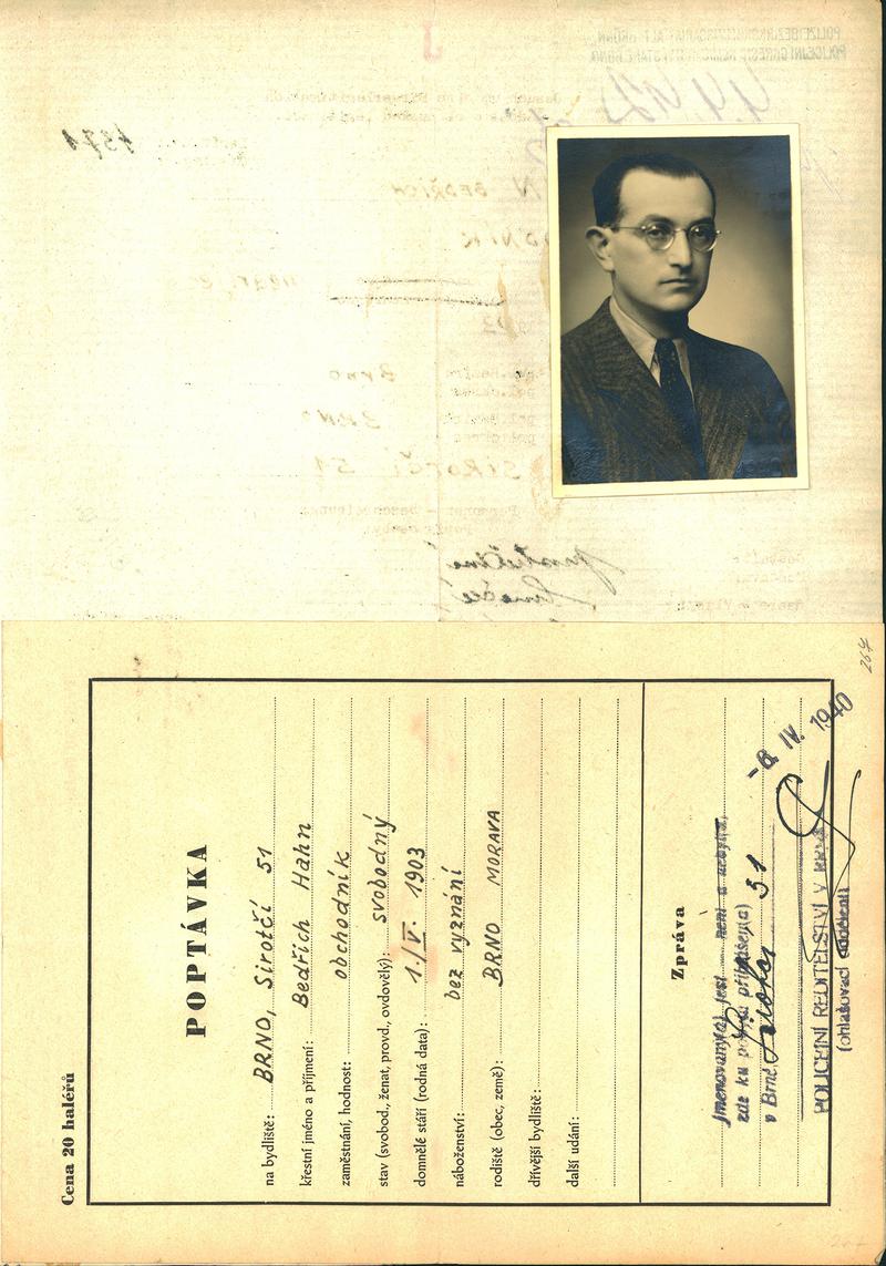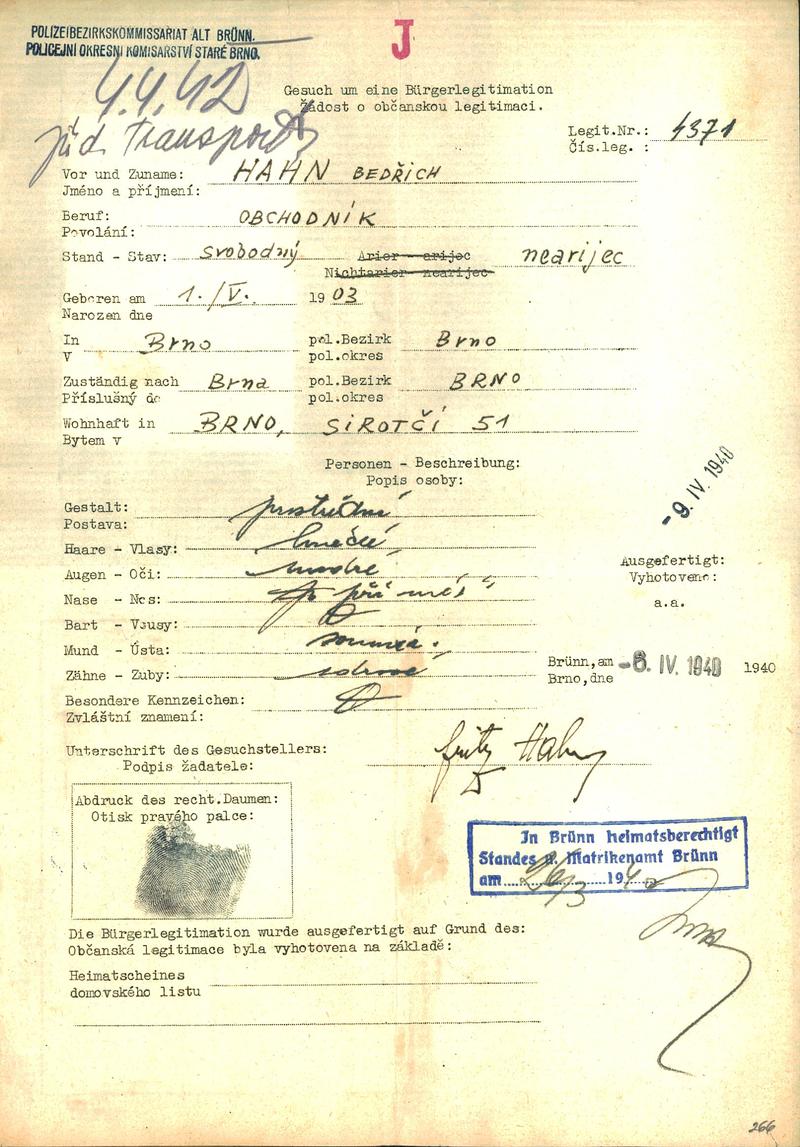 Moravský zemský archiv Brno > Policejní ředitelství Brno > Žádosti židovských občanů určených k transportu o občanské legitimace > Hahn Bedřich