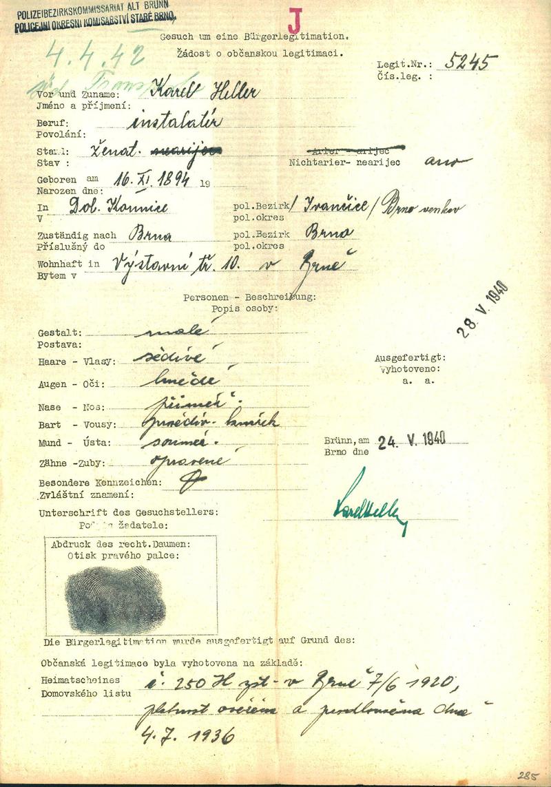 Moravský zemský archiv Brno > Policejní ředitelství Brno > Žádosti židovských občanů určených k transportu o občanské legitimace > Heller Karel