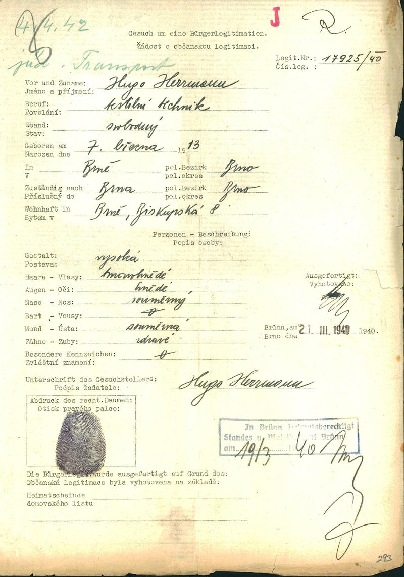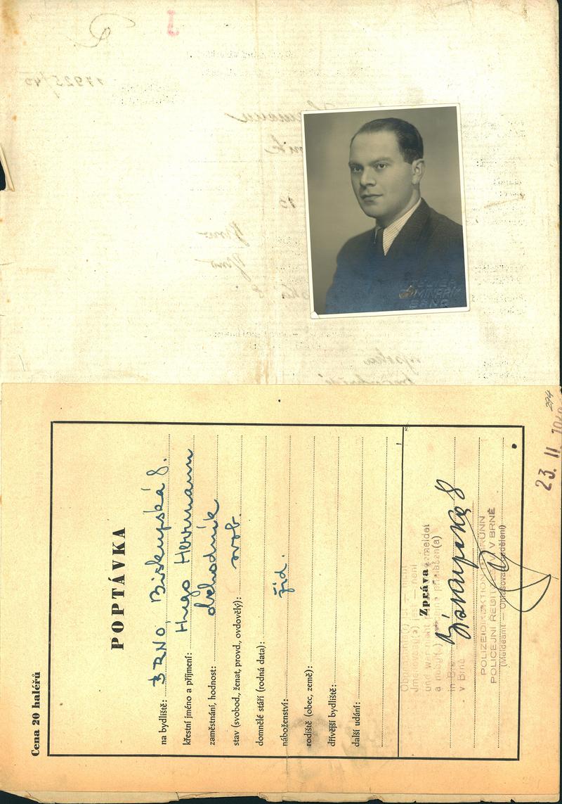 Moravský zemský archiv Brno > Policejní ředitelství Brno > Žádosti židovských občanů určených k transportu o občanské legitimace > Hermann Hugo