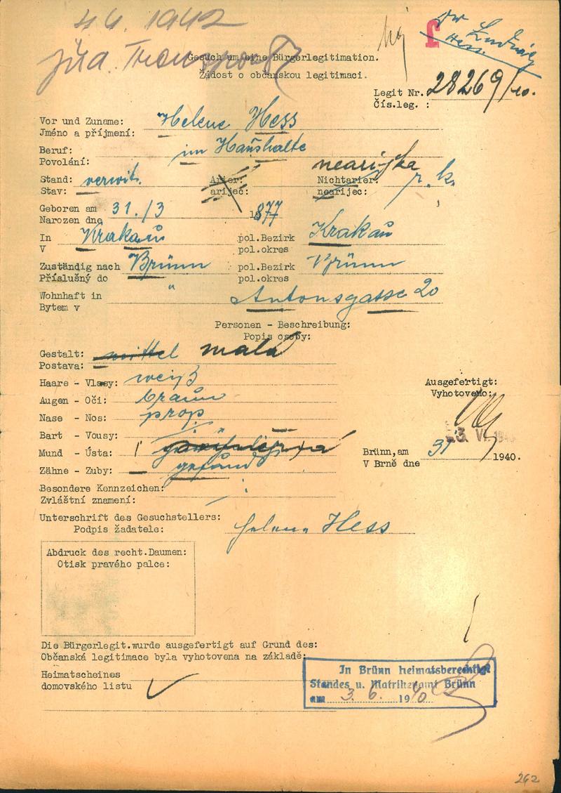 Moravský zemský archiv Brno > Policejní ředitelství Brno > Žádosti židovských občanů určených k transportu o občanské legitimace > Hessová Helena
