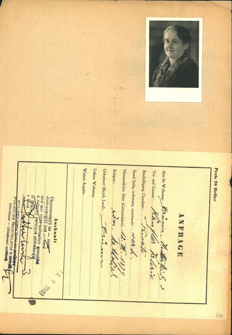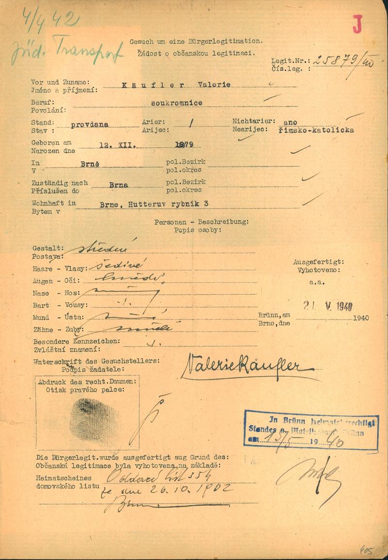 Moravský zemský archiv Brno > Policejní ředitelství Brno > Žádosti židovských občanů určených k transportu o občanské legitimace > Käuflerová Valerie