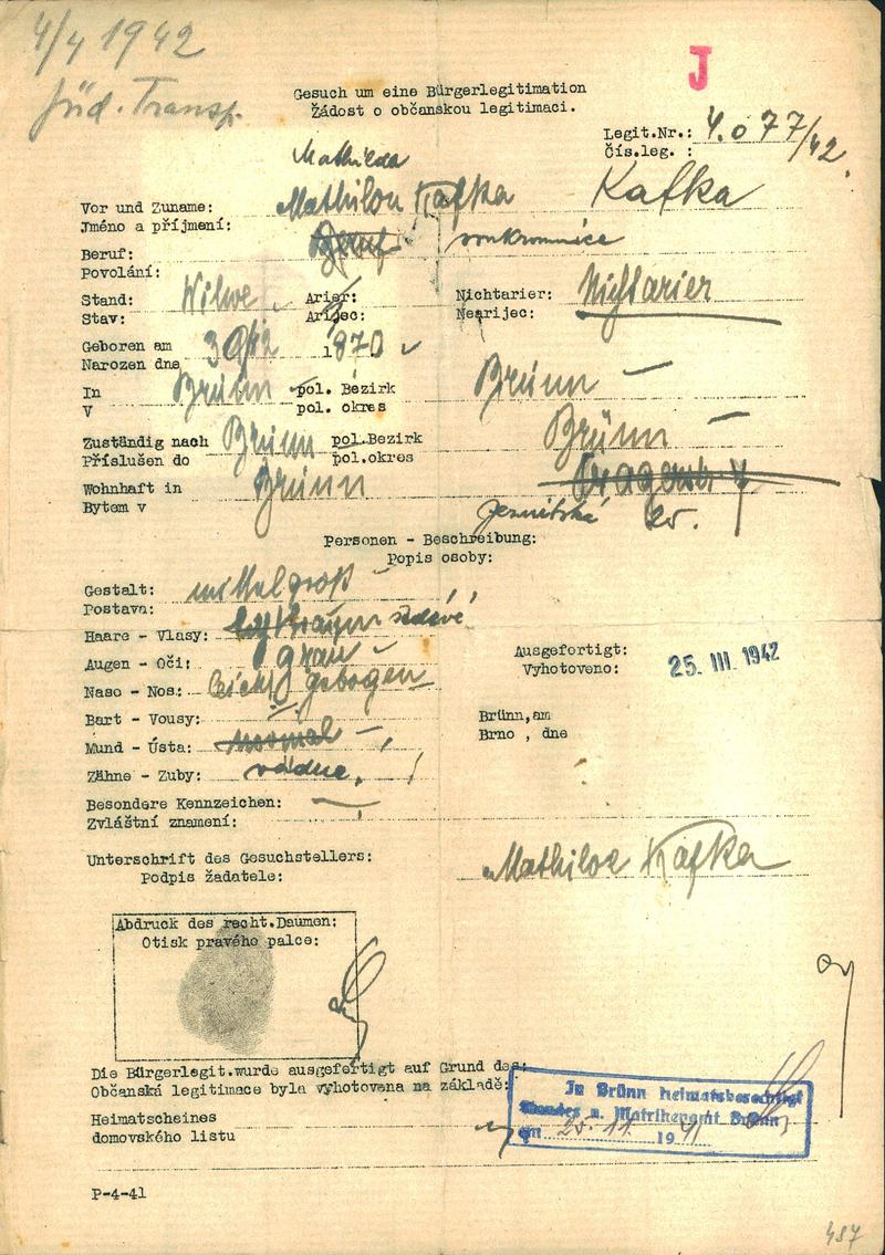 Moravský zemský archiv Brno > Policejní ředitelství Brno > Žádosti židovských občanů určených k transportu o občanské legitimace > Kafková Matilda