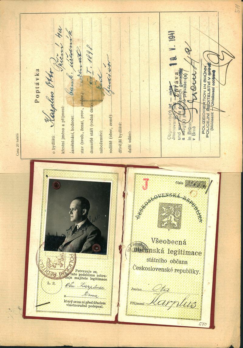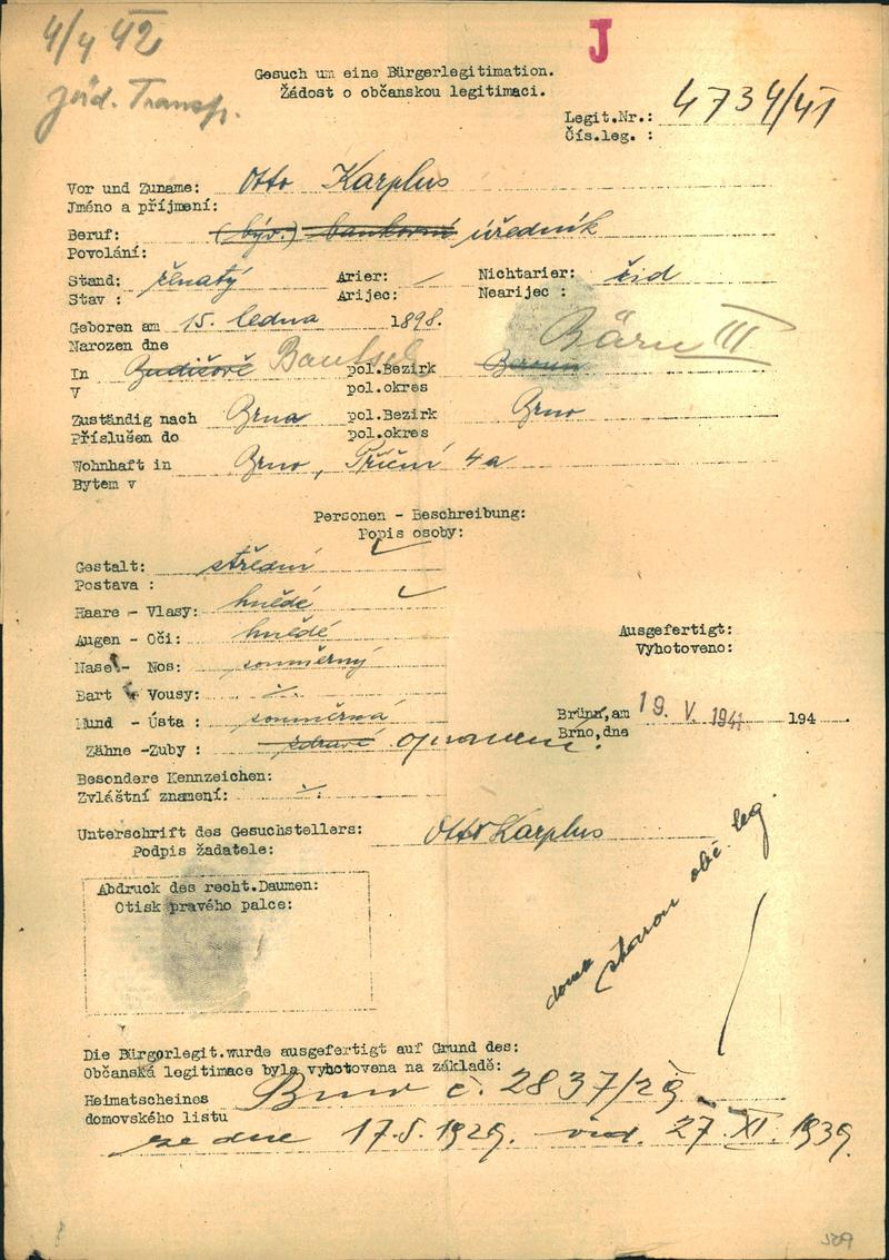 Moravský zemský archiv Brno > Policejní ředitelství Brno > Žádosti židovských občanů určených k transportu o občanské legitimace > Karplus Otto