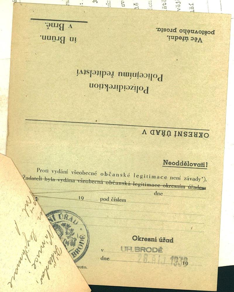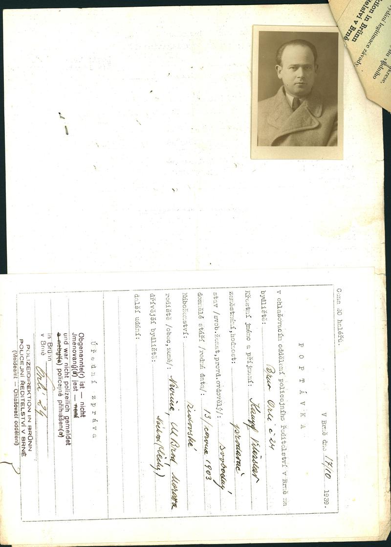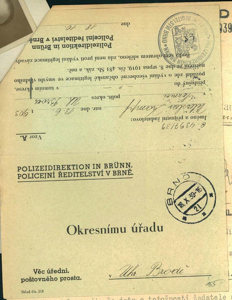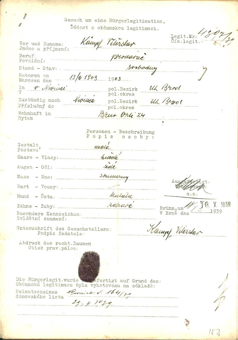 Moravský zemský archiv Brno > Policejní ředitelství Brno > Dodatky > Žádosti židovských občanů určených k transportu o občanské legitimace > Kämpf Vítězslav