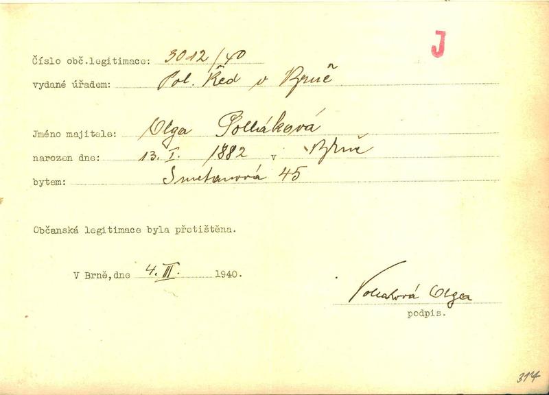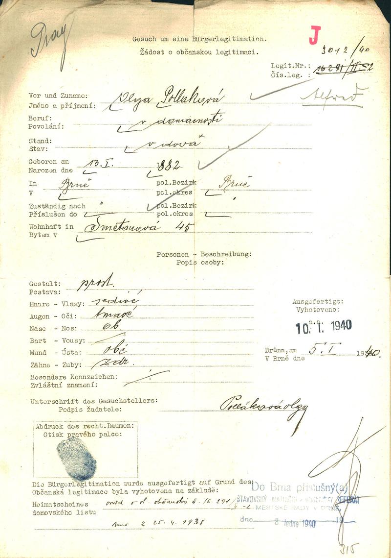Moravský zemský archiv Brno > Policejní ředitelství Brno > Dodatky > Žádosti židovských občanů určených k transportu o občanské legitimace > Pollaková Olga