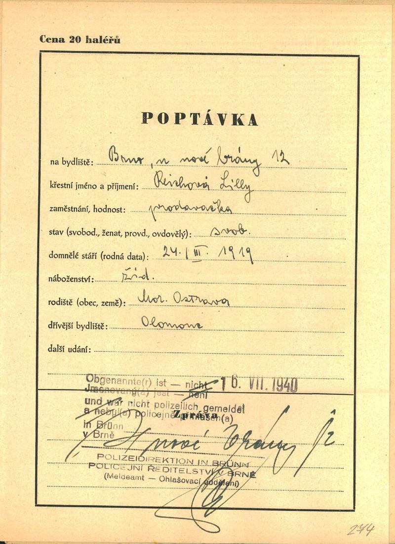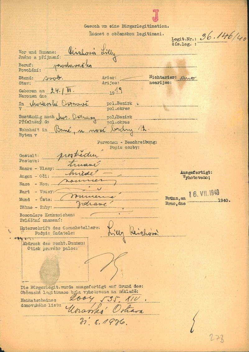 Moravský zemský archiv Brno > Policejní ředitelství Brno > Dodatky > Žádosti židovských občanů určených k transportu o občanské legitimace > Salpeterová Lily