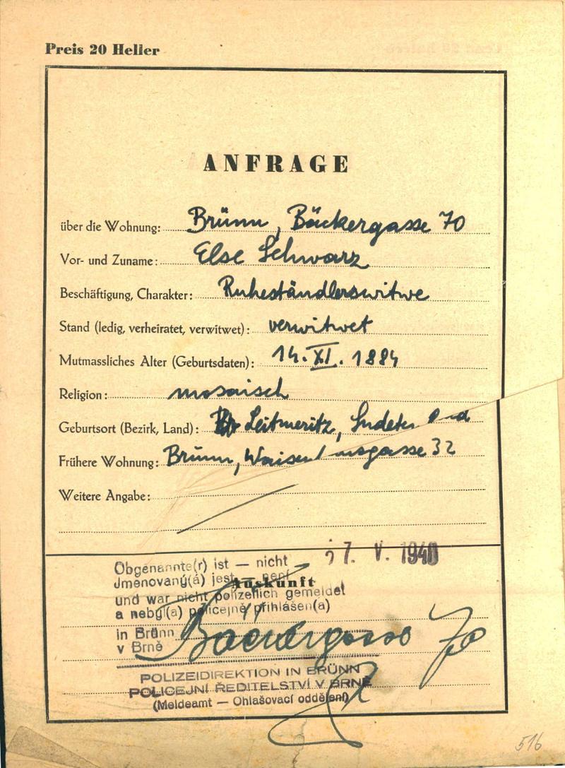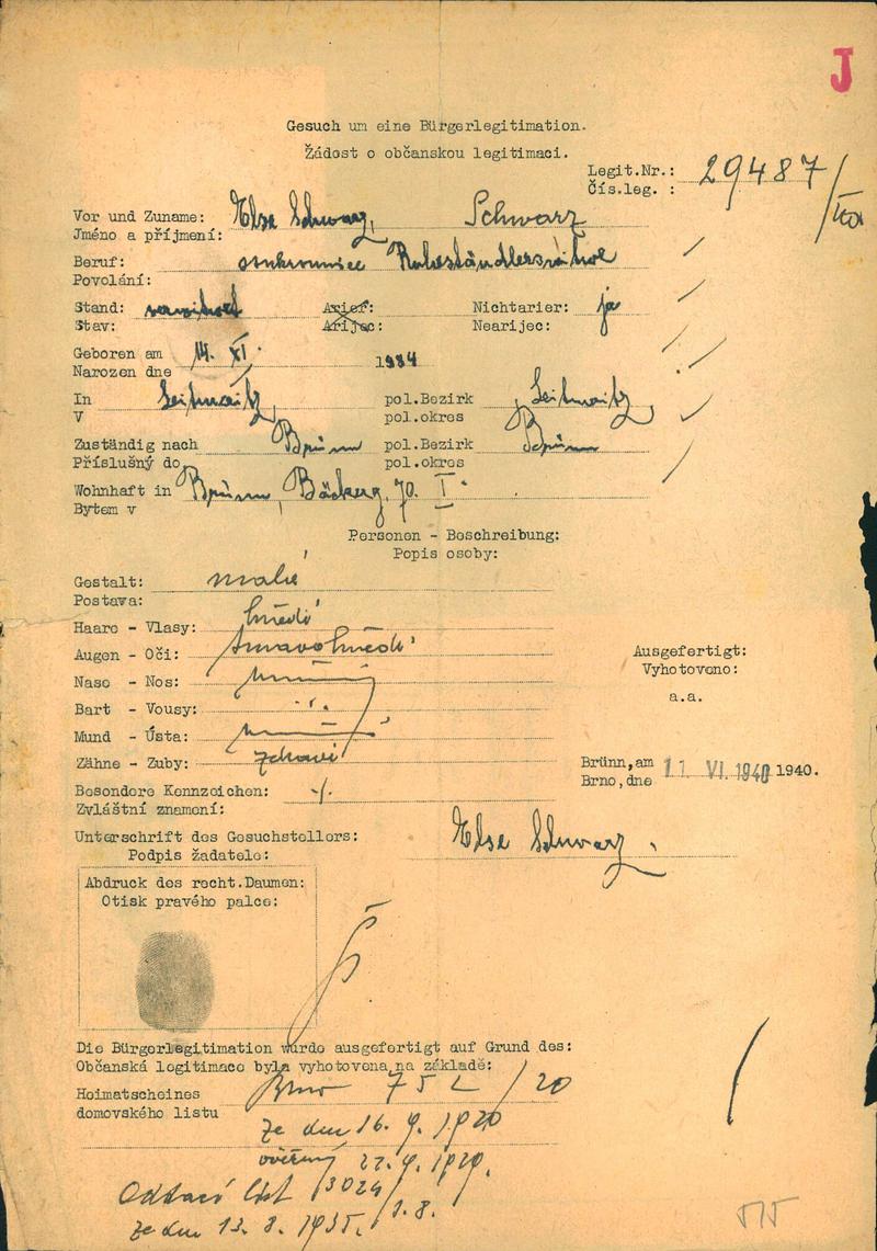 Moravský zemský archiv Brno > Policejní ředitelství Brno > Dodatky > Žádosti židovských občanů určených k transportu o občanské legitimace > Schwarzová Elsa