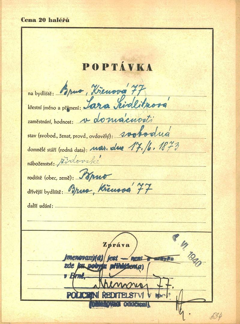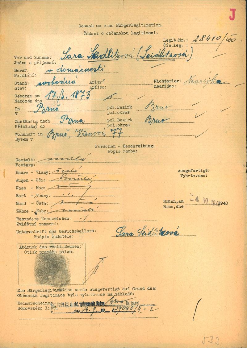 Moravský zemský archiv Brno > Policejní ředitelství Brno > Dodatky > Žádosti židovských občanů určených k transportu o občanské legitimace > Seidlitzová Sára