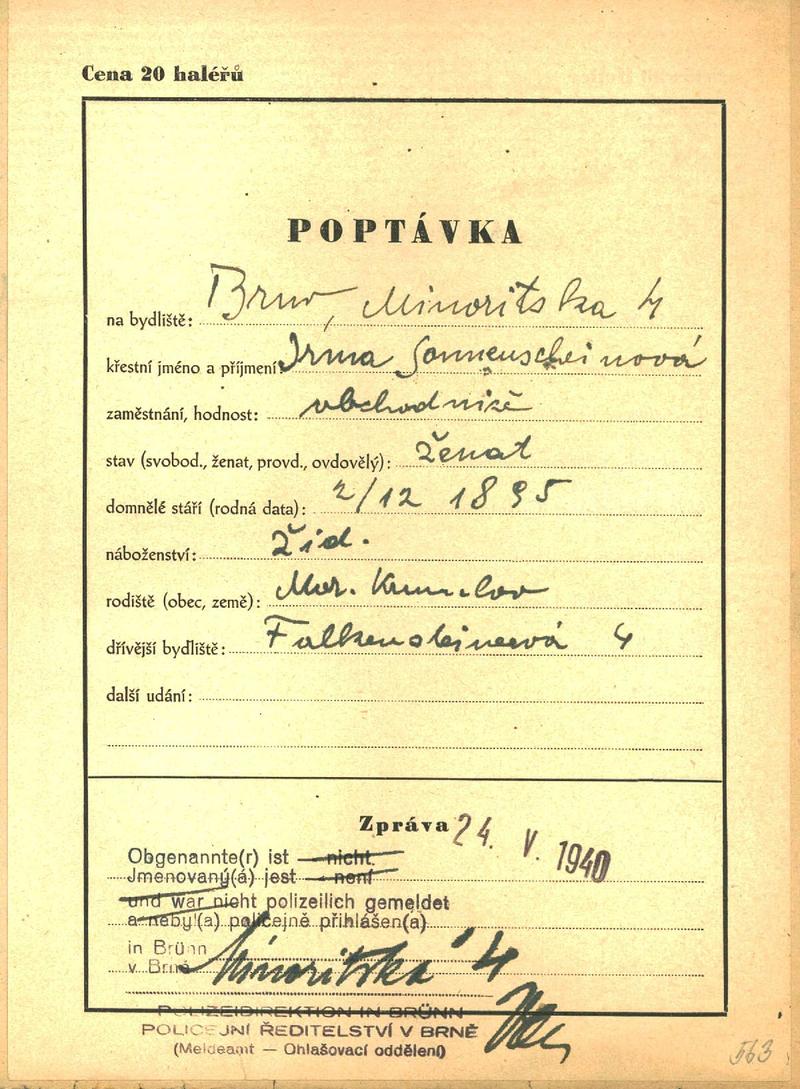 Moravský zemský archiv Brno > Policejní ředitelství Brno > Dodatky > Žádosti židovských občanů určených k transportu o občanské legitimace > Sonnenscheinová Irma