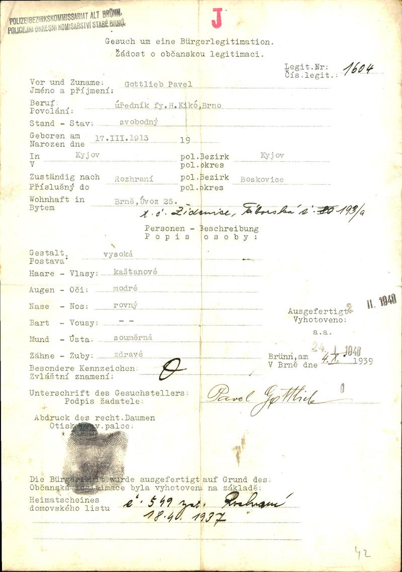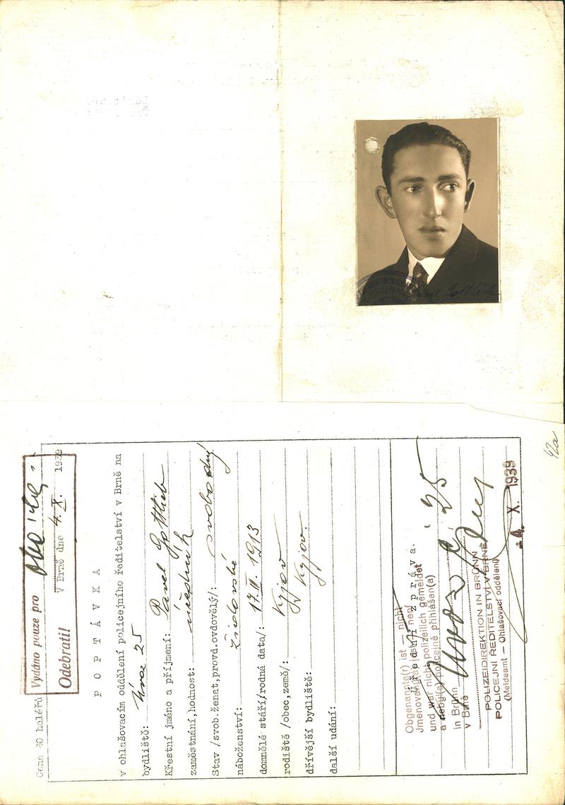 Moravský zemský archiv Brno > Policejní ředitelství Brno > Dodatky > Žádosti židovských občanů určených k transportu o občanské legitimace > Gottlieb Pavel