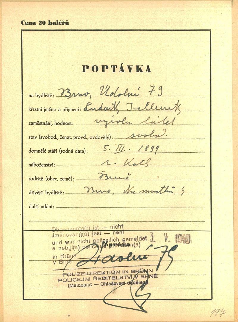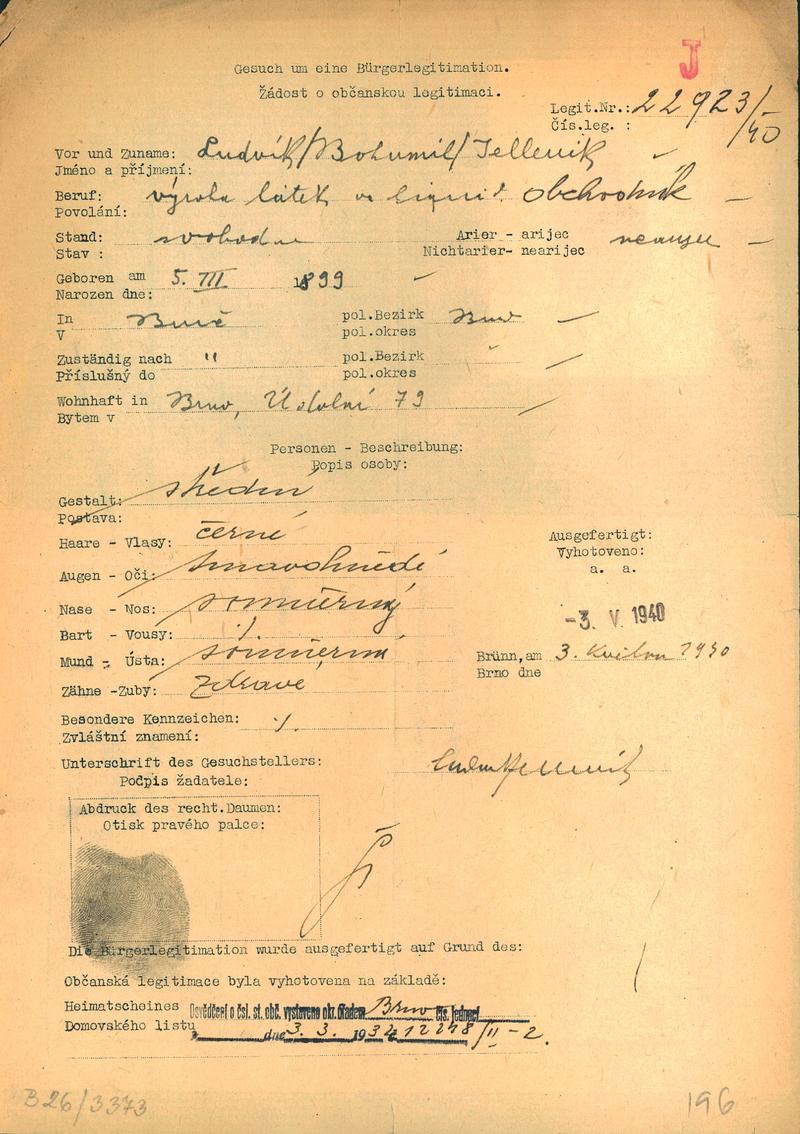 Moravský zemský archiv Brno > Policejní ředitelství Brno > Dodatky > Žádosti židovských občanů určených k transportu o občanské legitimace > Jellenik Ludvík