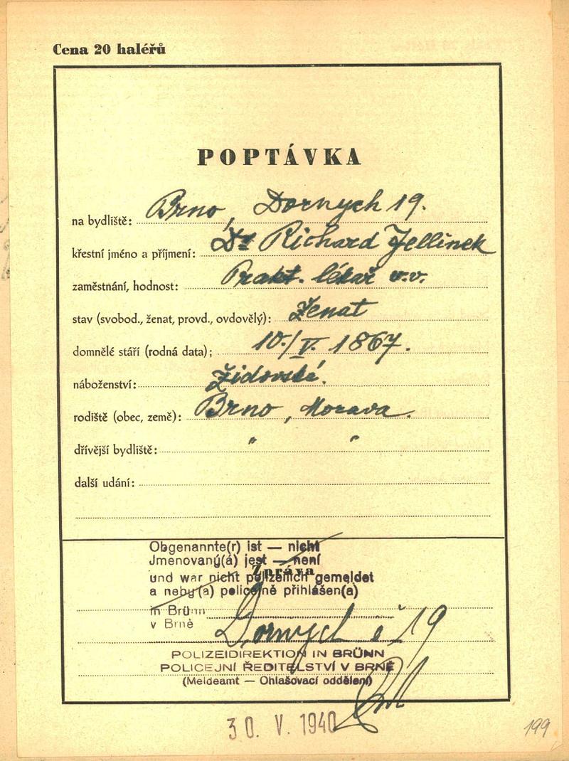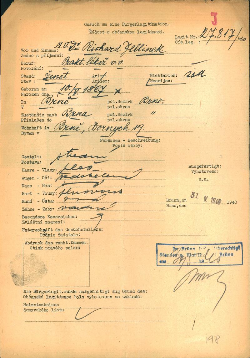 Moravský zemský archiv Brno > Policejní ředitelství Brno > Dodatky > Žádosti židovských občanů určených k transportu o občanské legitimace > Jellinek Richard