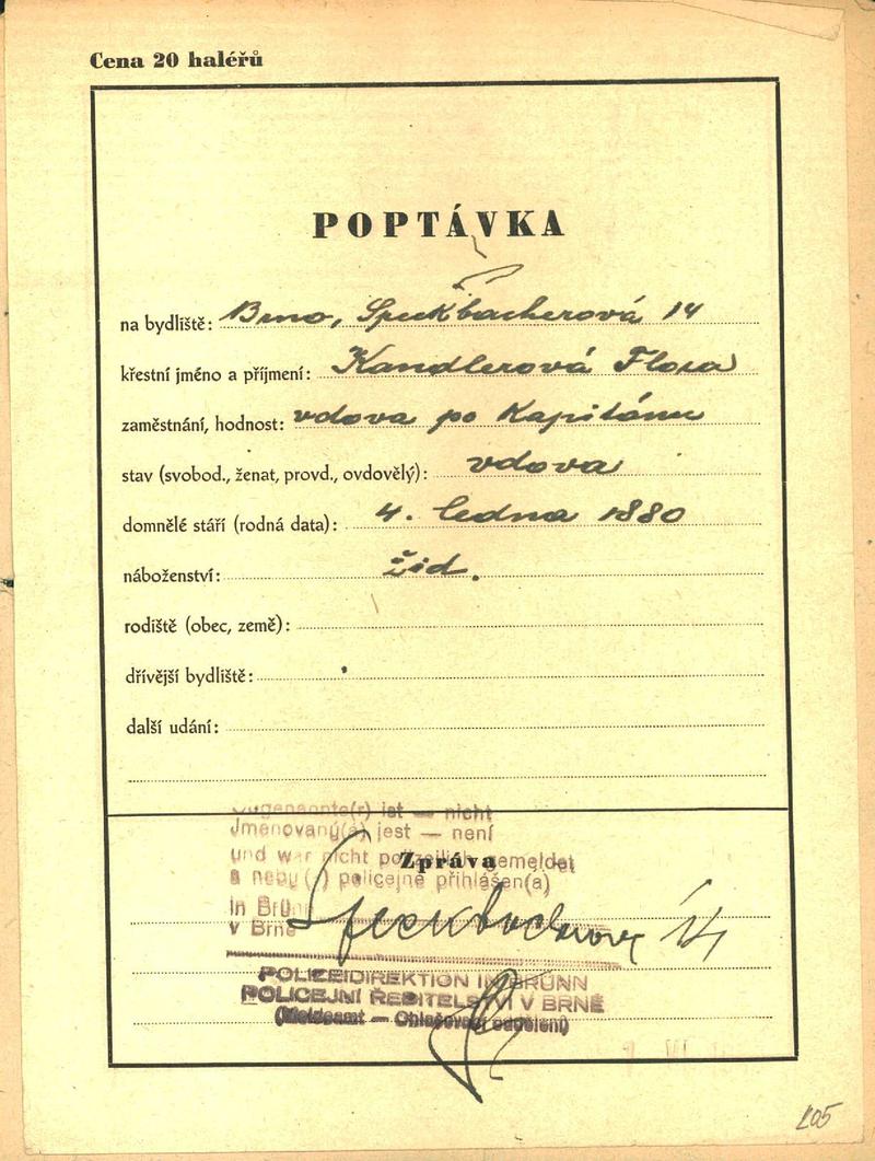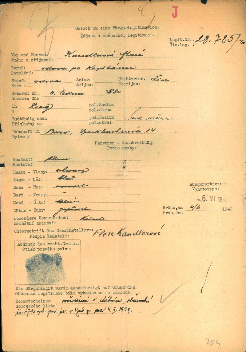 Moravský zemský archiv Brno > Policejní ředitelství Brno > Dodatky > Žádosti židovských občanů určených k transportu o občanské legitimace > Kandlerová Flora