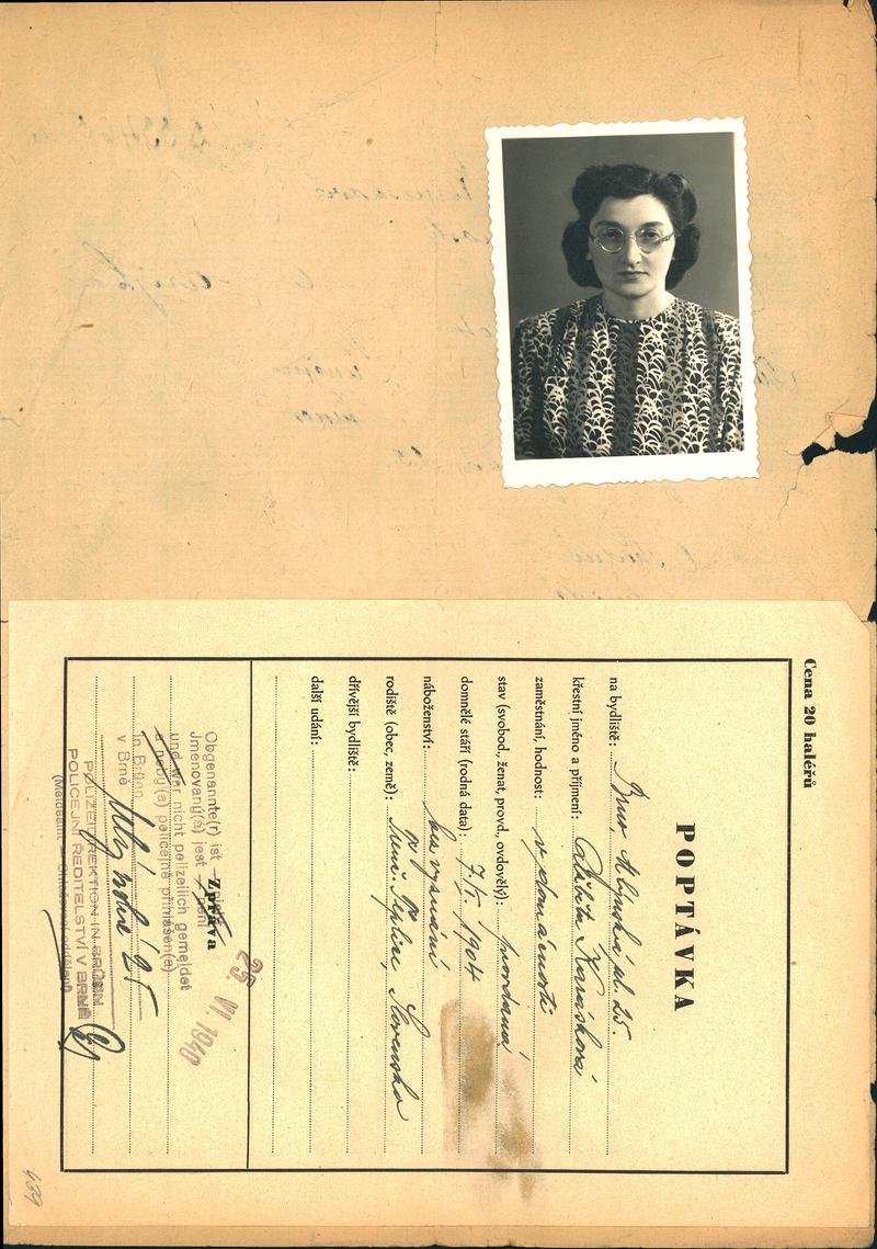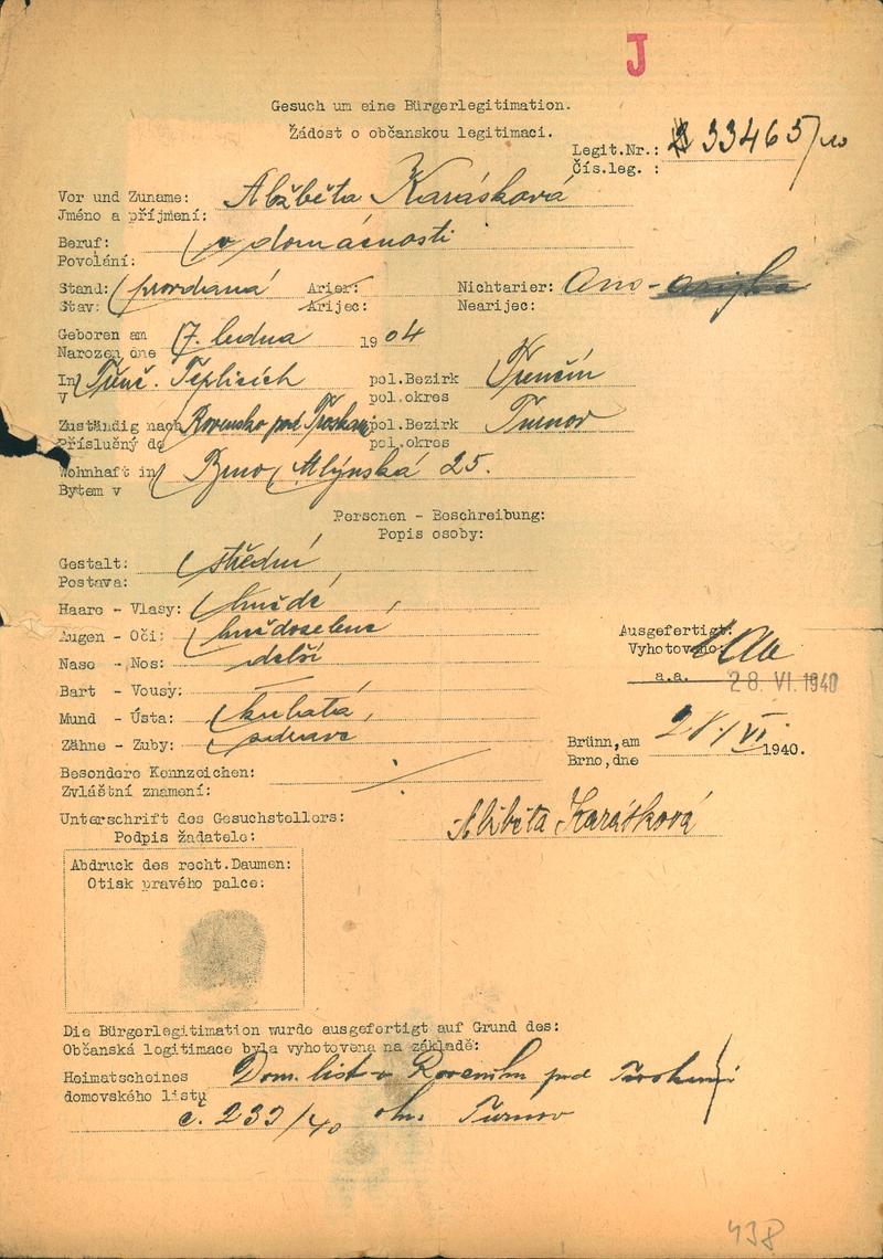 Moravský zemský archiv Brno > Policejní ředitelství Brno > Dodatky > Žádosti židovských občanů určených k transportu o občanské legitimace > Karásková Alžběta