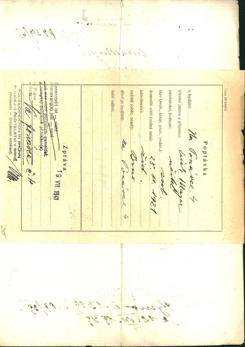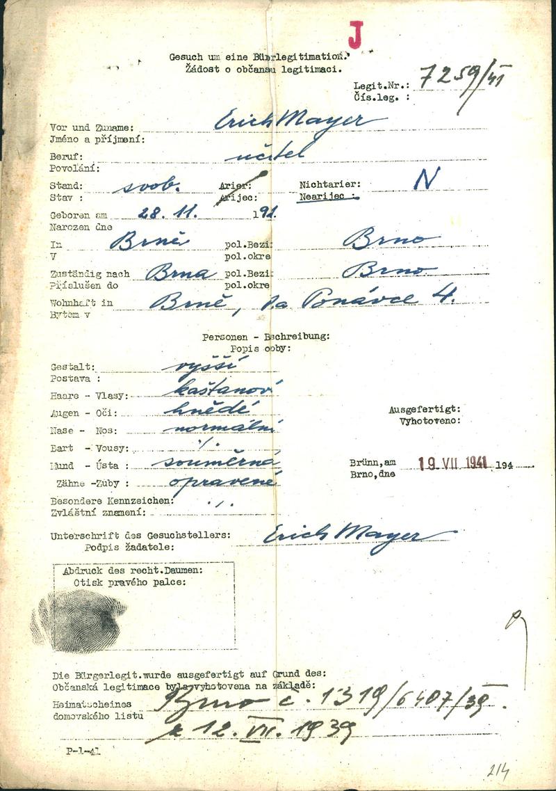 Moravský zemský archiv Brno > Policejní ředitelství Brno > Dodatky > Žádosti židovských občanů určených k transportu o občanské legitimace > Mayer Erich