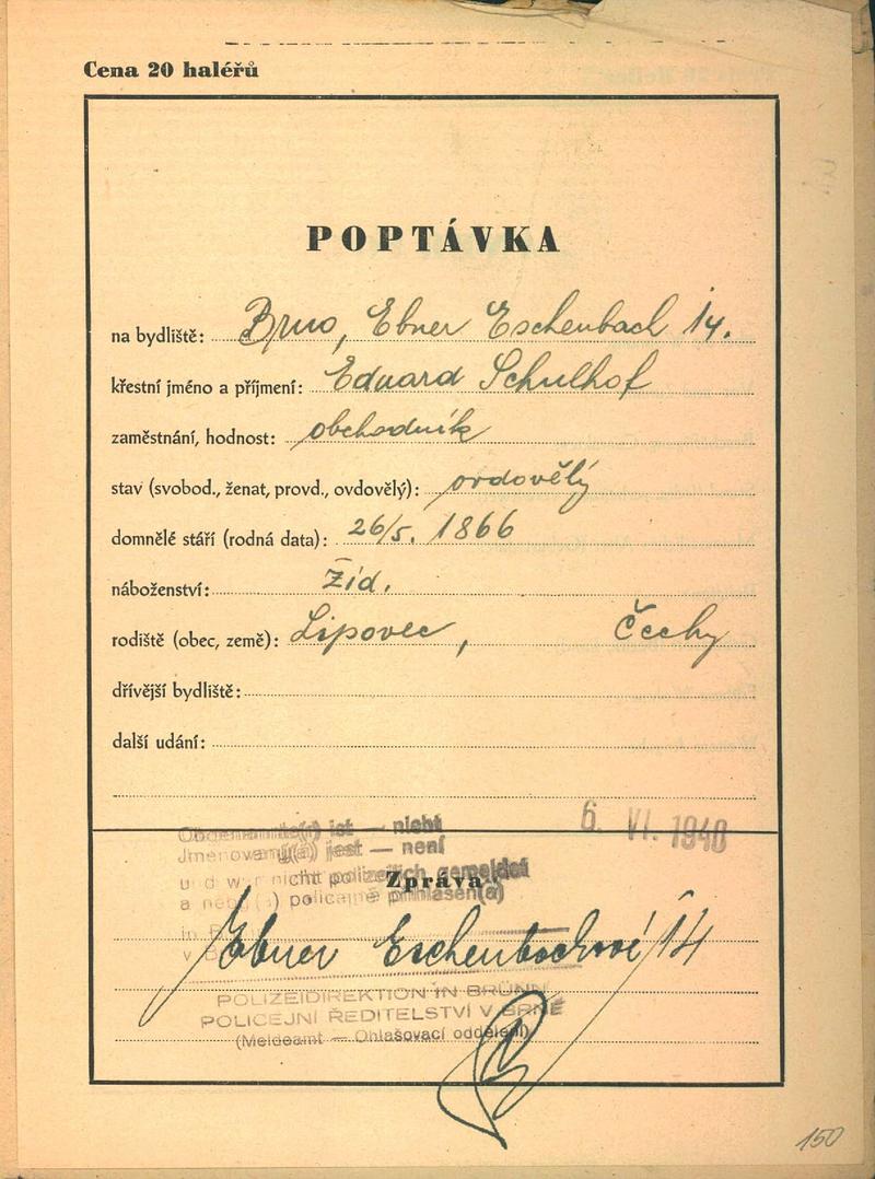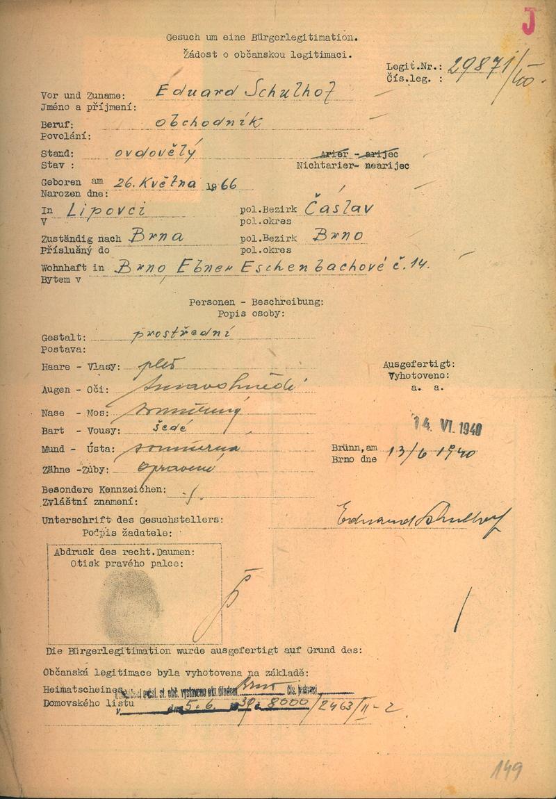 Moravský zemský archiv Brno > Policejní ředitelství Brno > Dodatky > Žádosti židovských občanů určených k transportu o občanské legitimace > Schulhof Eduard