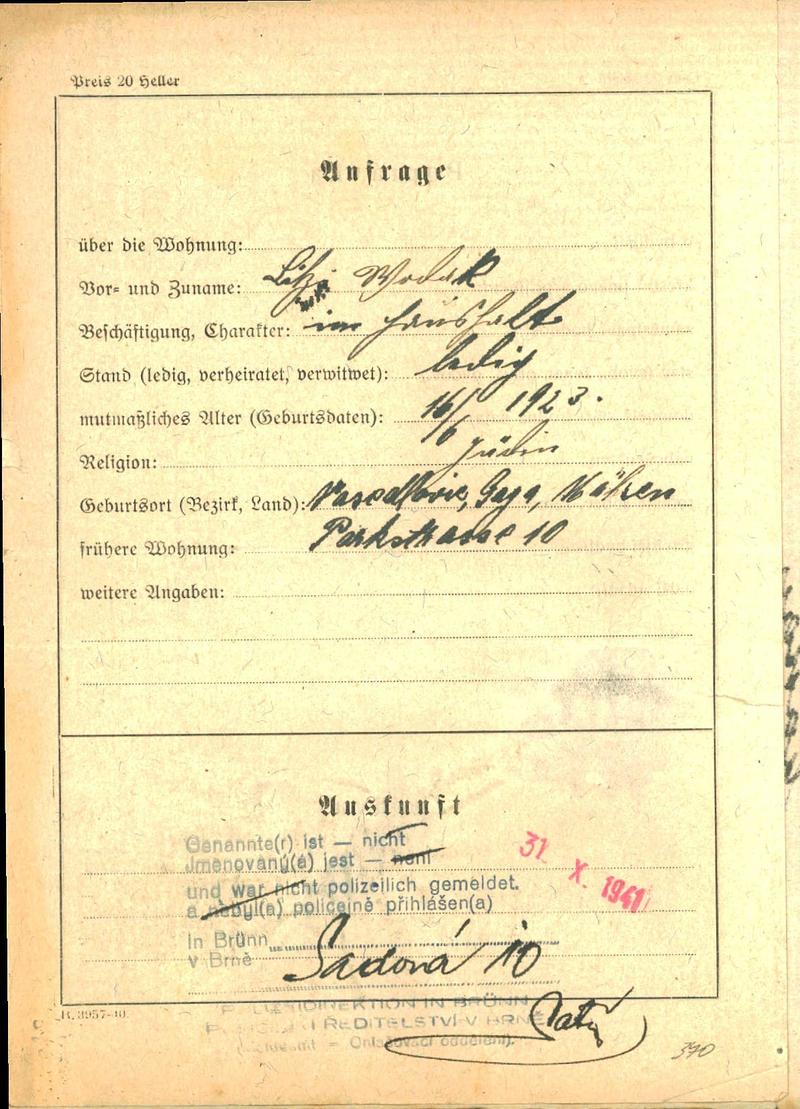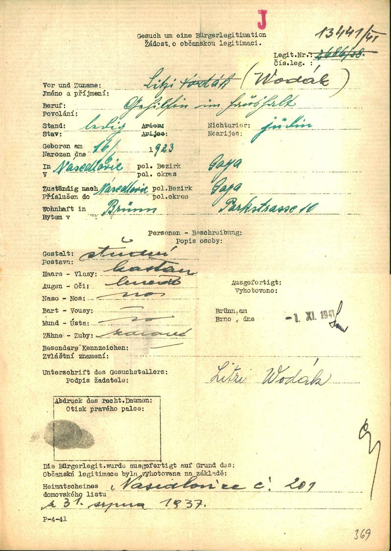 Moravský zemský archiv Brno > Policejní ředitelství Brno > Dodatky > Žádosti židovských občanů určených k transportu o občanské legitimace > Vodaková Litzi
