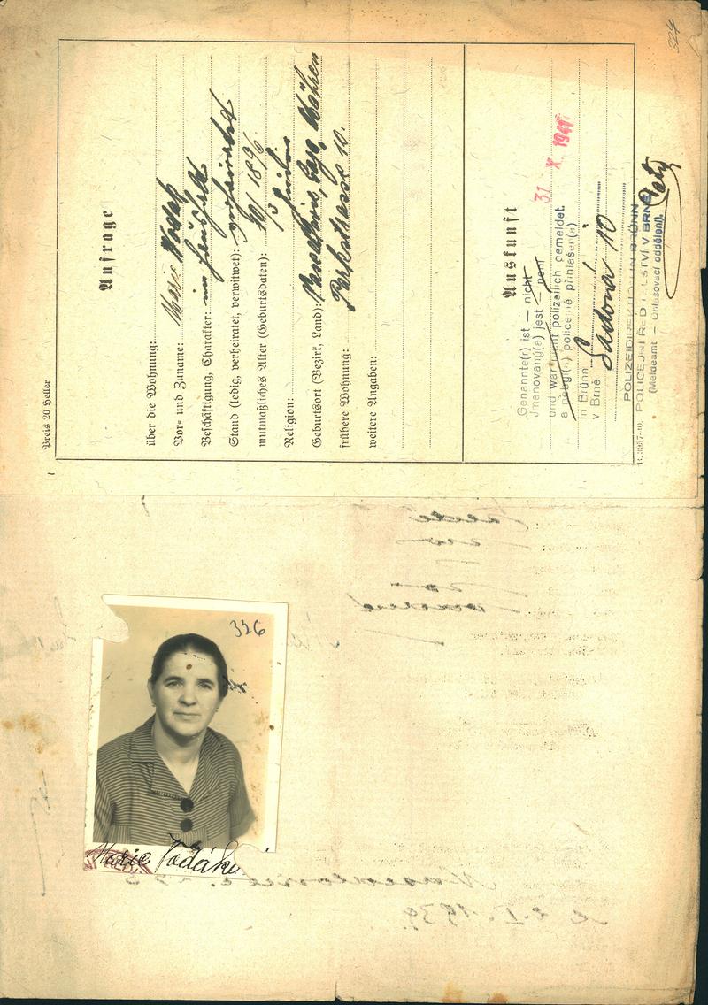 Moravský zemský archiv Brno > Policejní ředitelství Brno > Dodatky > Žádosti židovských občanů určených k transportu o občanské legitimace > Vodaková Marie
