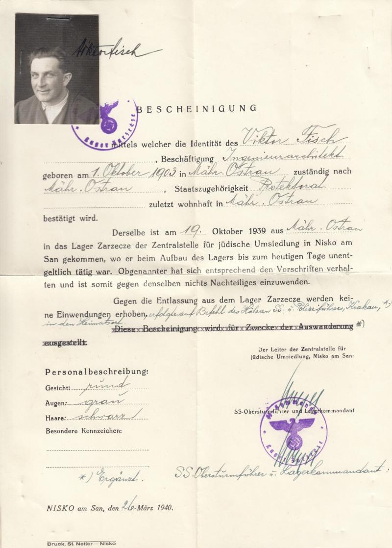 Fisch Viktor: Potvrzení o propuštění z tábora v Nisku nad Sanem
