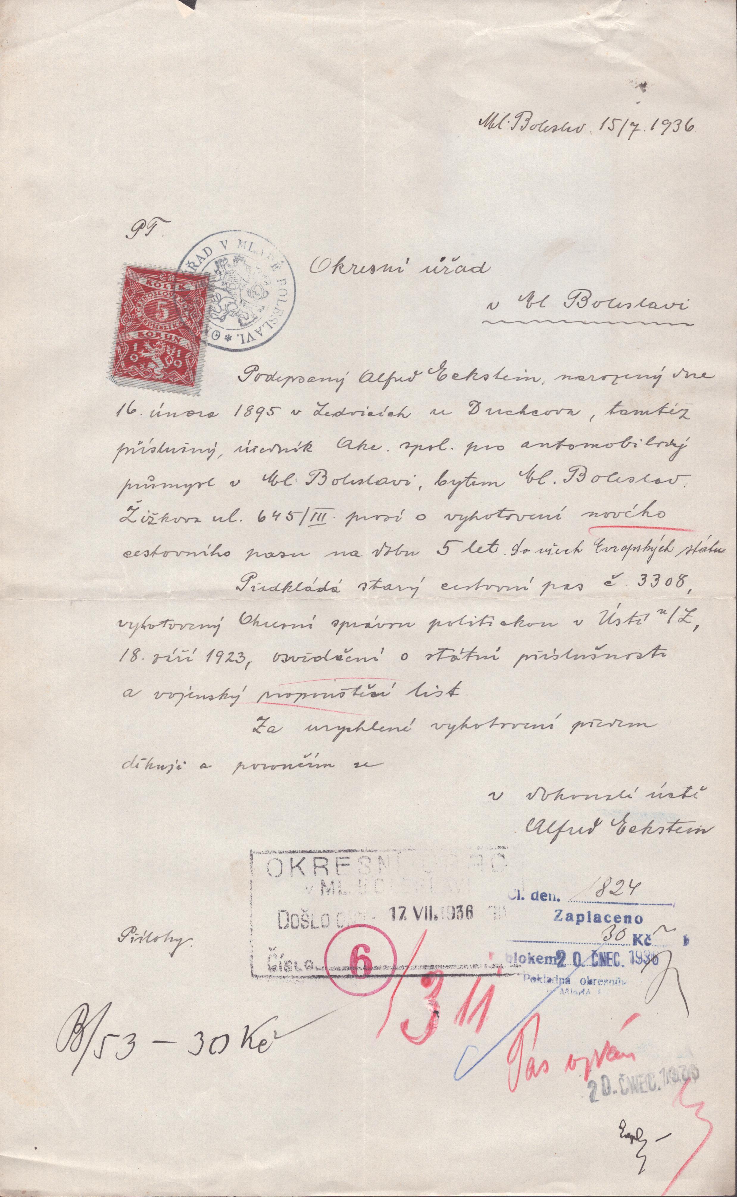 Eckstein Alfred: Žádost o vydání cestovního pasu