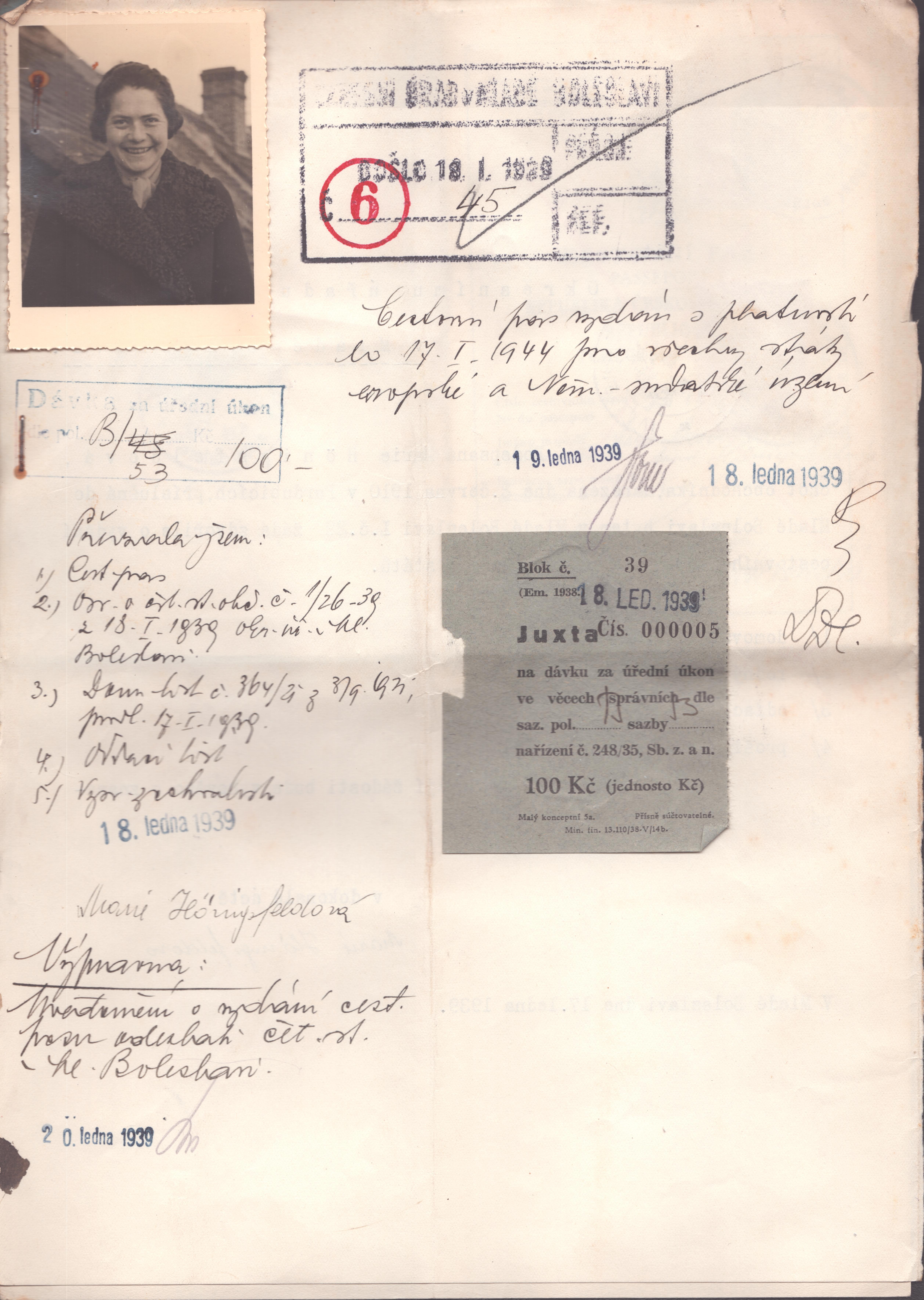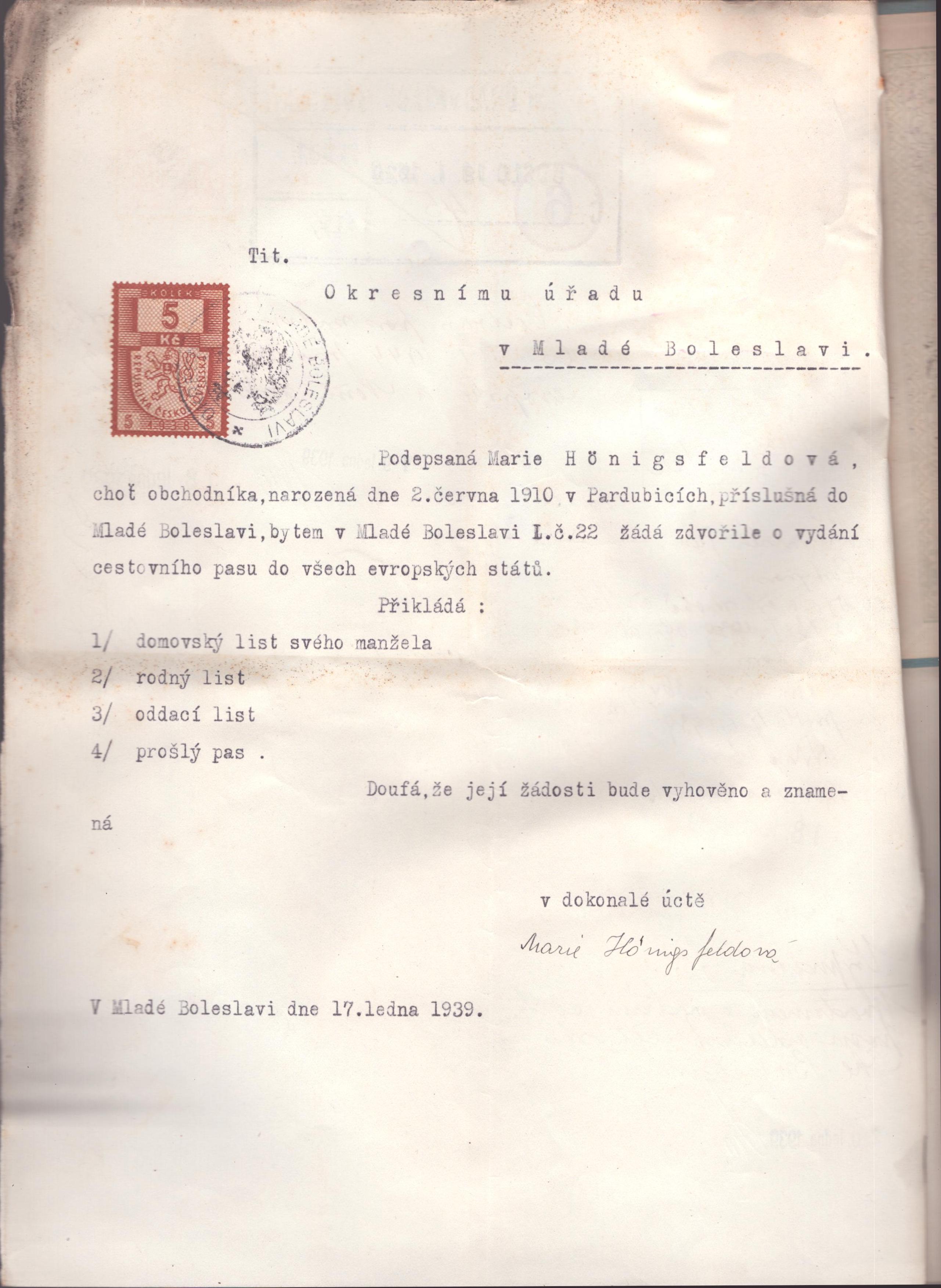 Hönigsfeldová Marie: Žádost o vystavení cestovního pasu