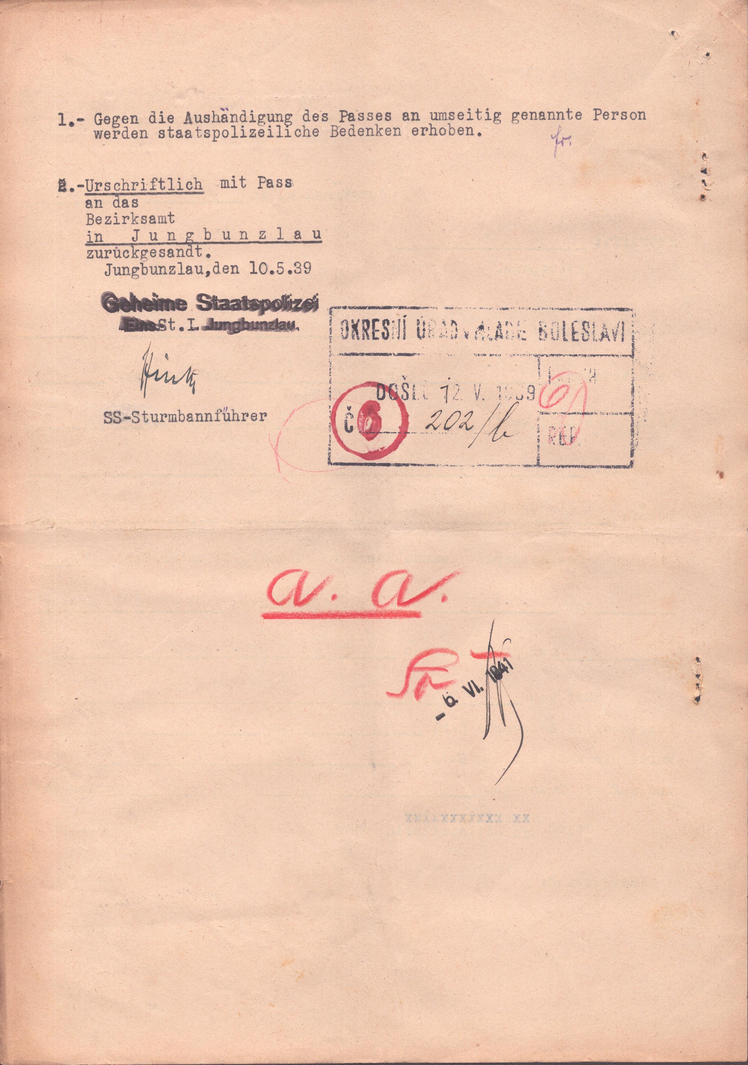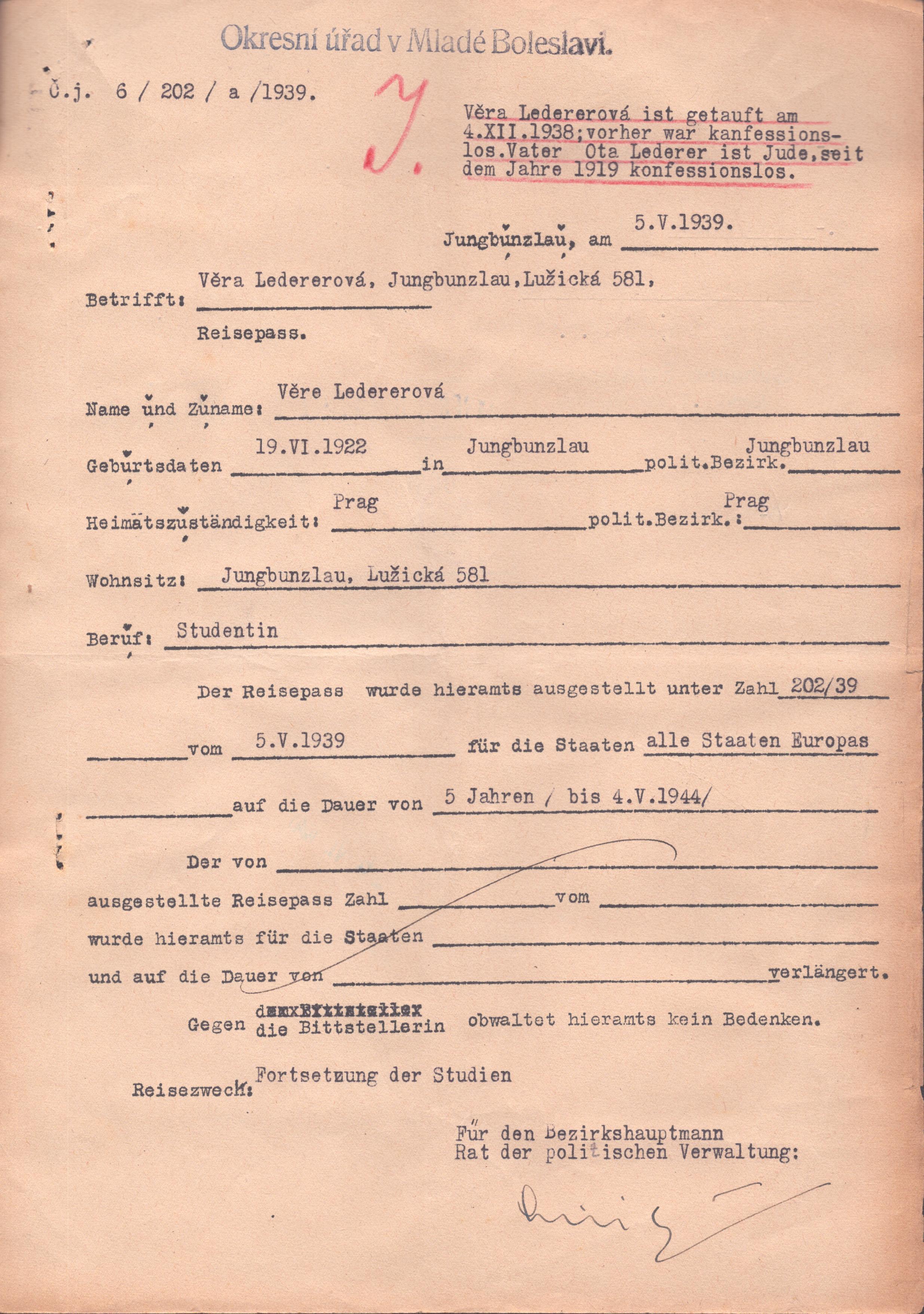 Ledererová Věra: Potvrzení o vydání cestovního pasu s vyjádřením gestapa
