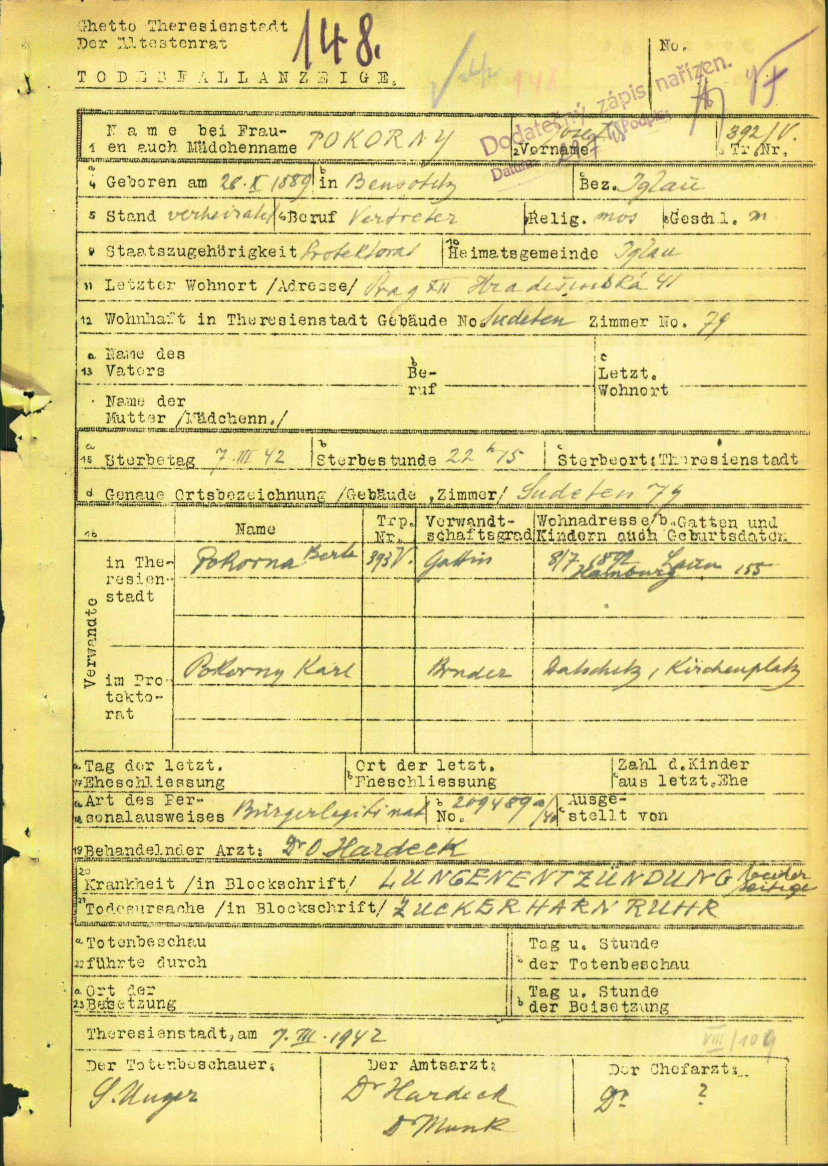 Pokorný Josef: Death certificate, Ghetto Terezín