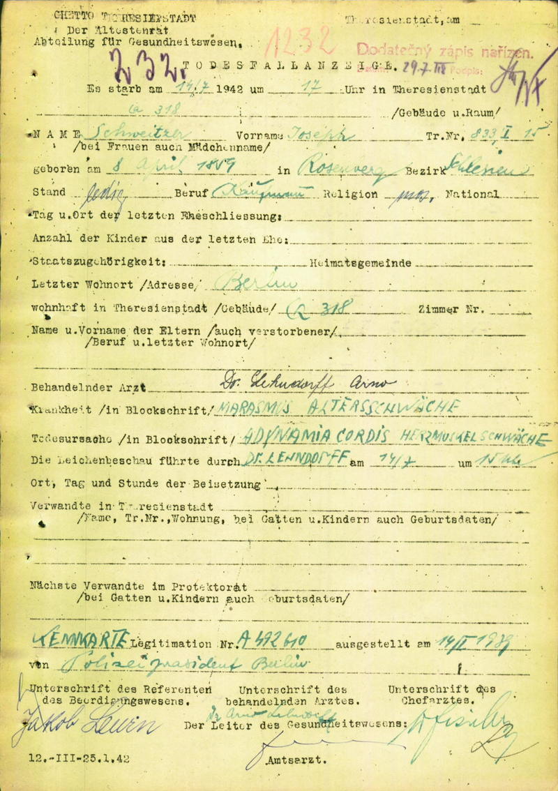 Schweitzer Josef: Death certificate, Ghetto Terezín