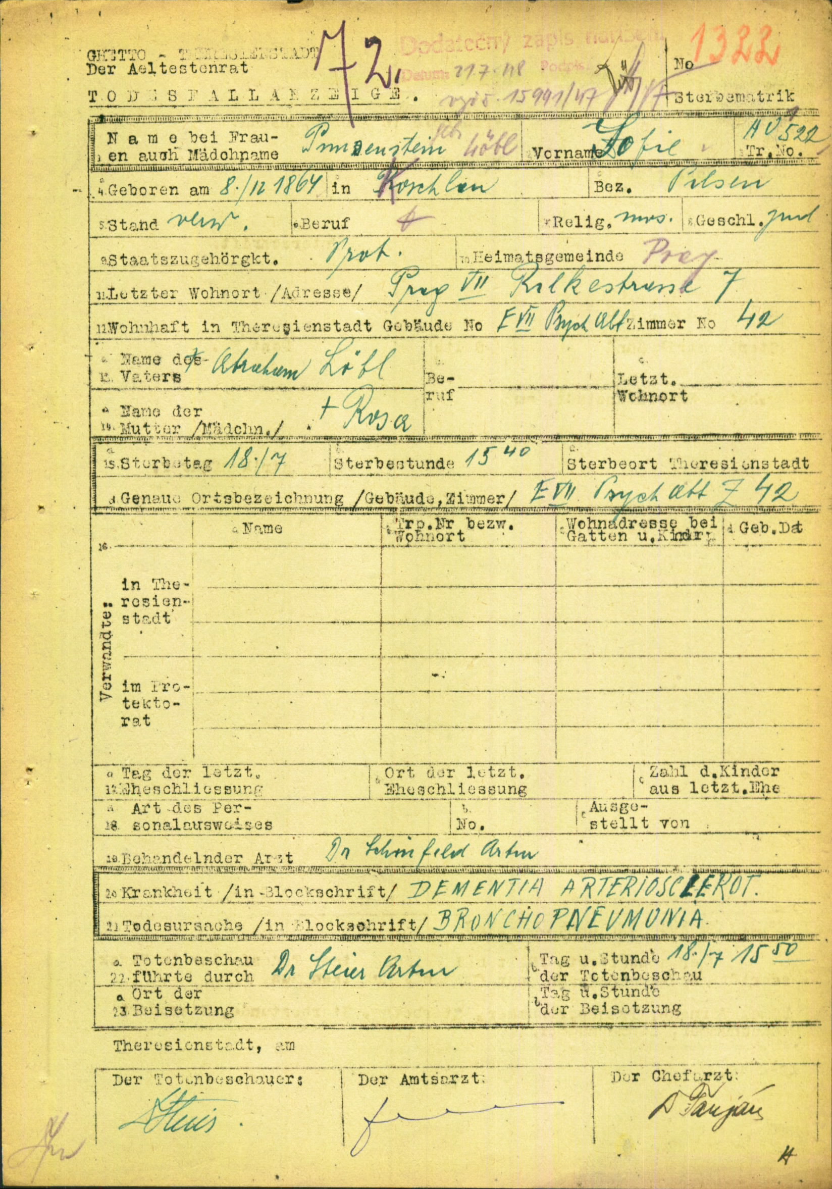 Pimsensteinová Žofie: Death certificate, Ghetto Terezín