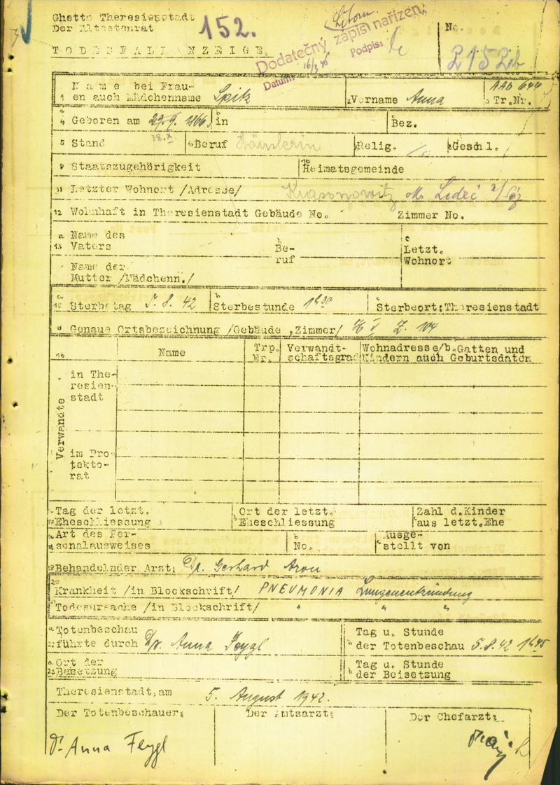 Spitzová Anna: Death certificate, Ghetto Terezín