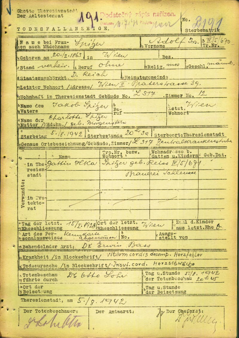 Spitzer Adolf: Death certificate, Ghetto Terezín