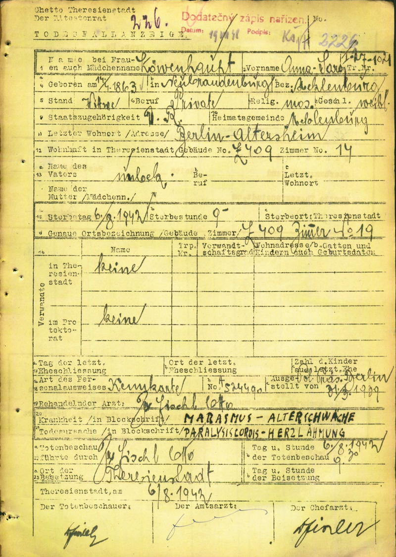 Löwenhaupt Anna: Death certificate, Ghetto Terezín
