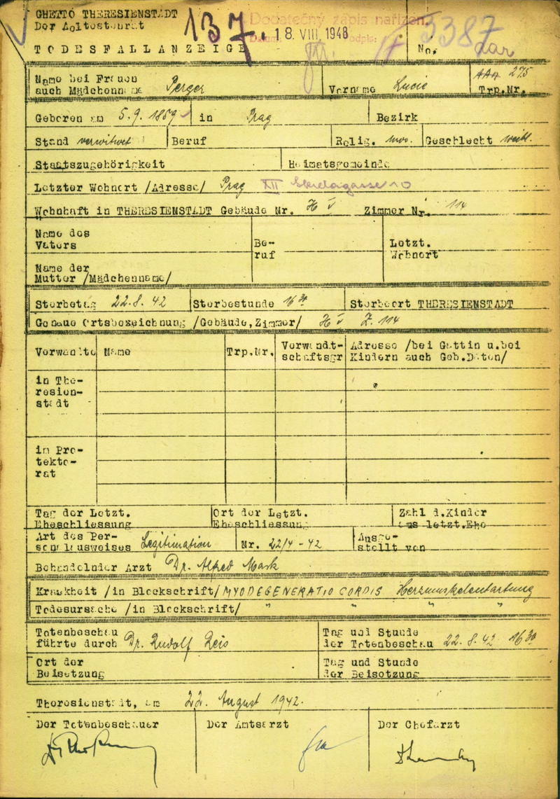 Pergerová Lucie: Death certificate, Ghetto Terezín